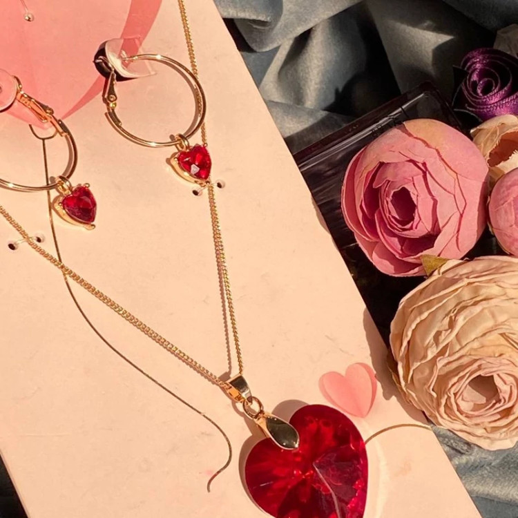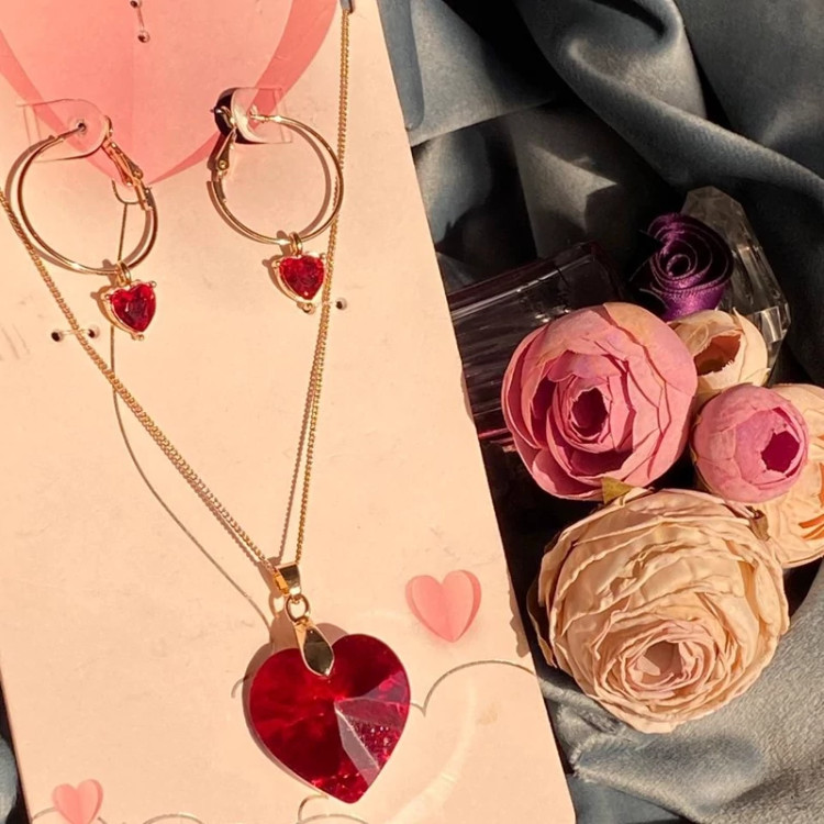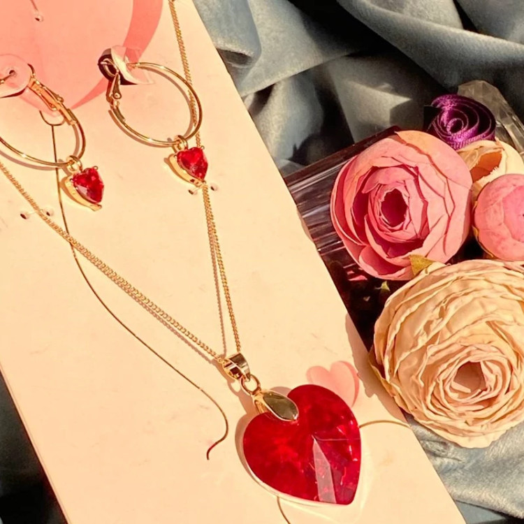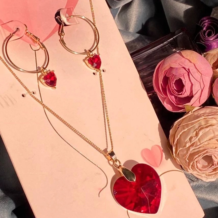 ست گردنبند و گوشواره قلب قرمز زنانه