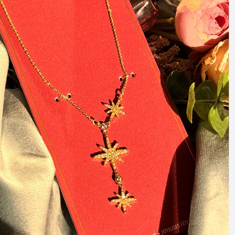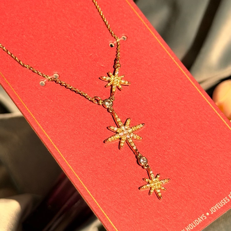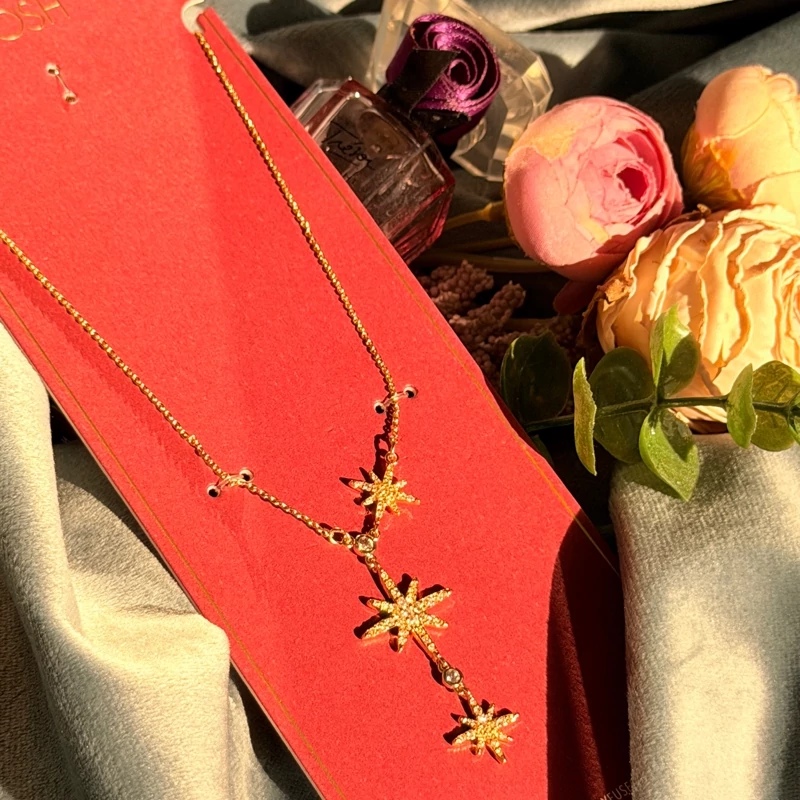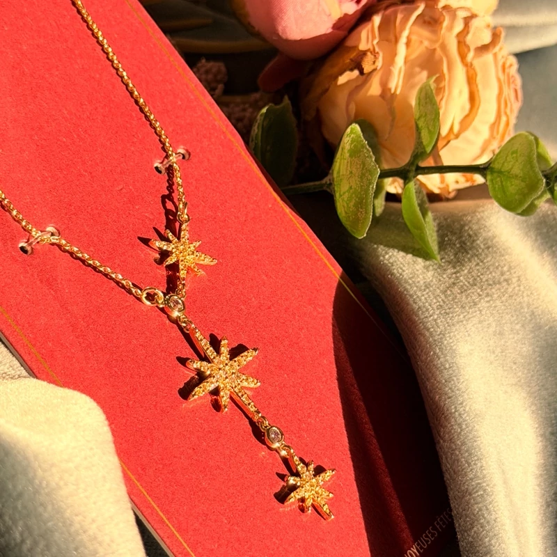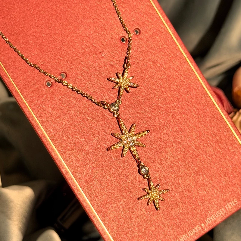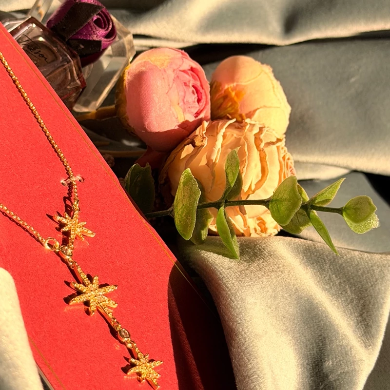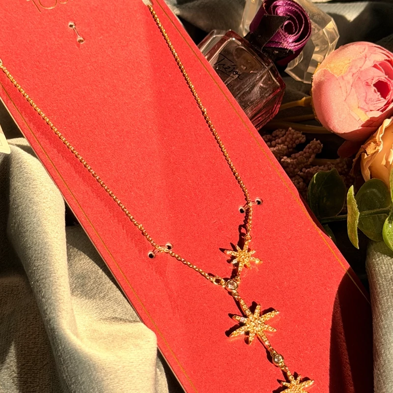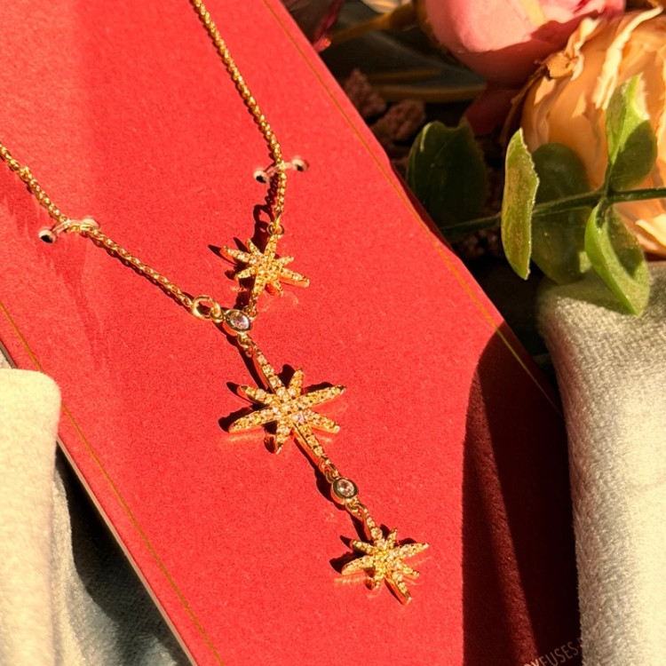 ستارهی ظریف با نگینهای درخشان، روی گردن میدرخشه و حس خاص بودن میده؛ دقیقاً همون جزئیاتی که استایل رو متفاوت و چشمگیر میکنه.
