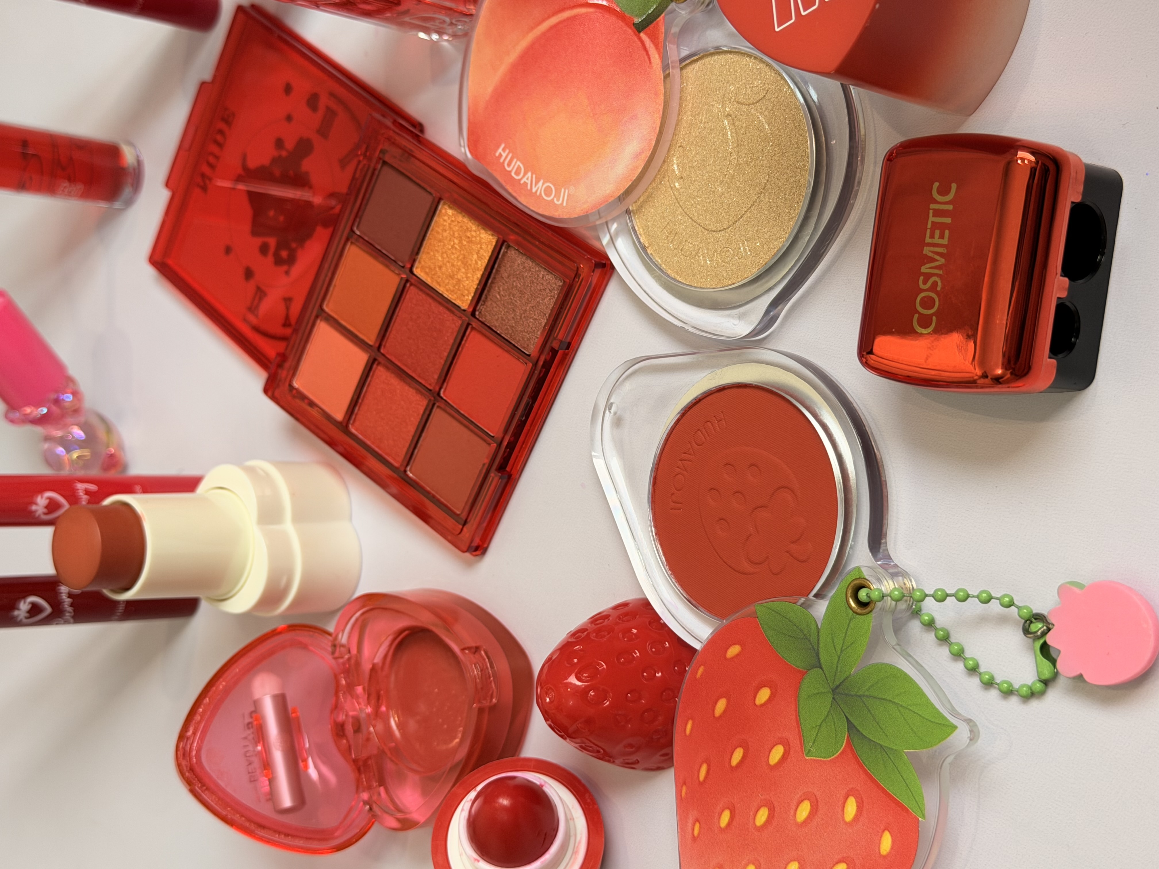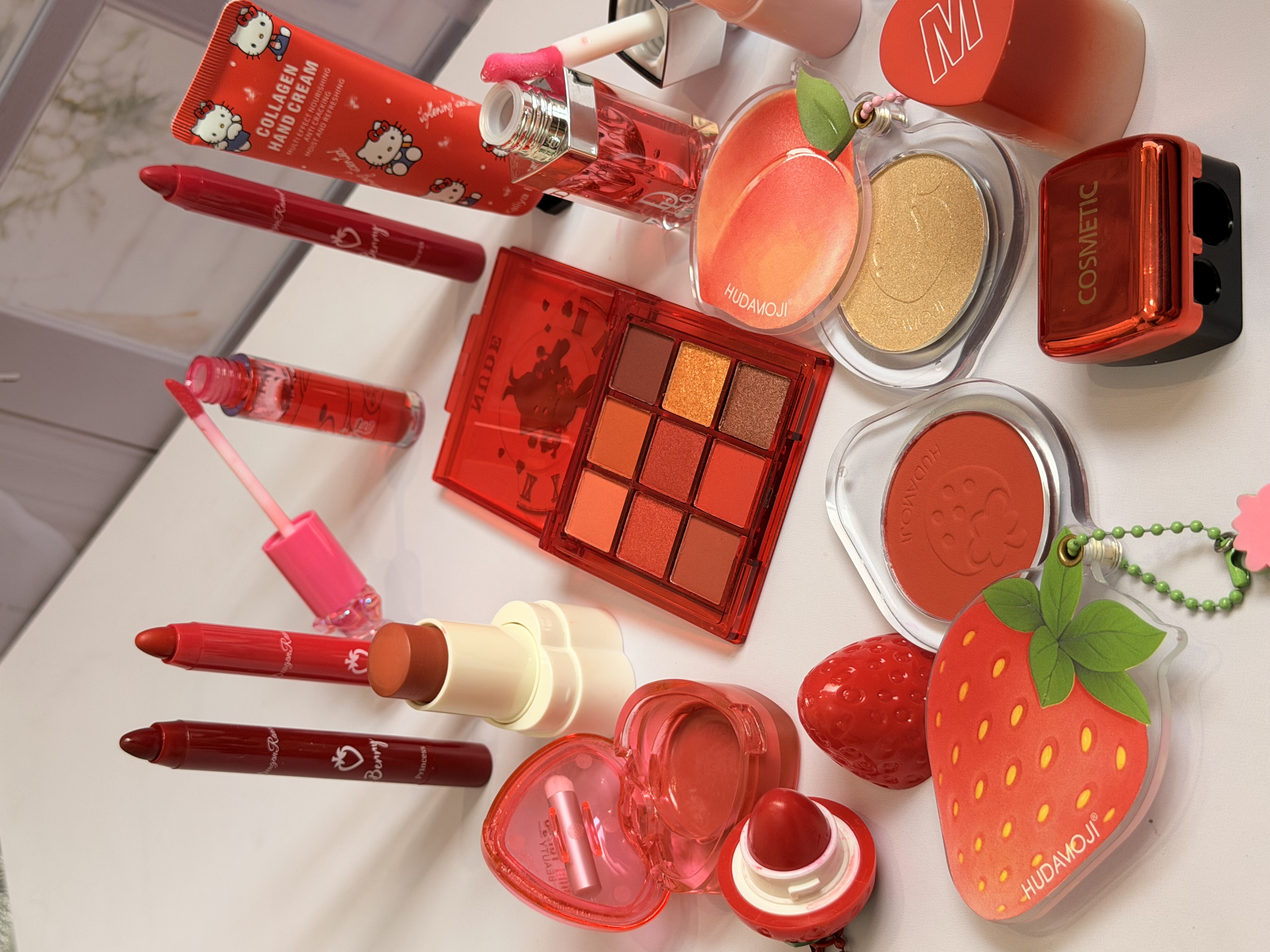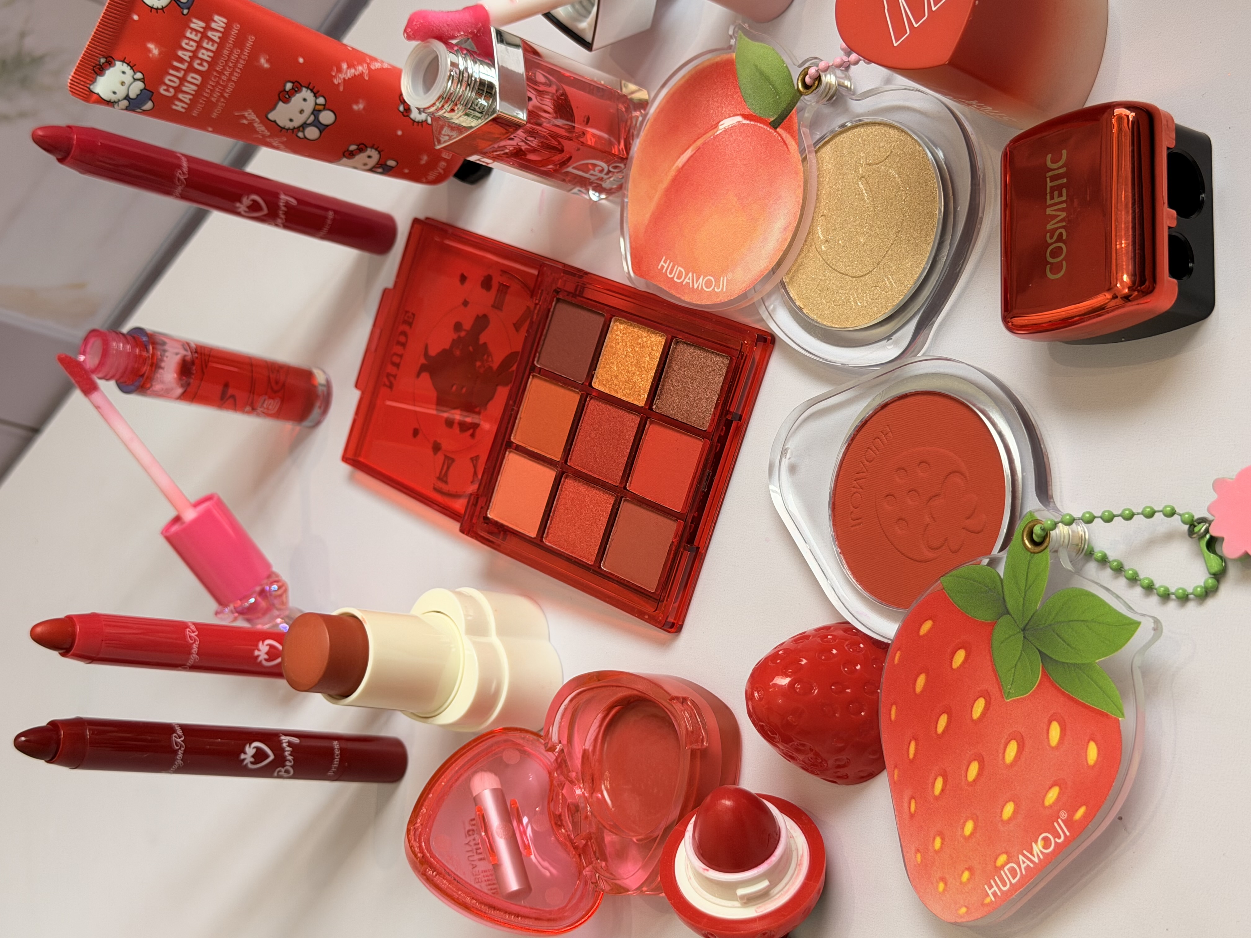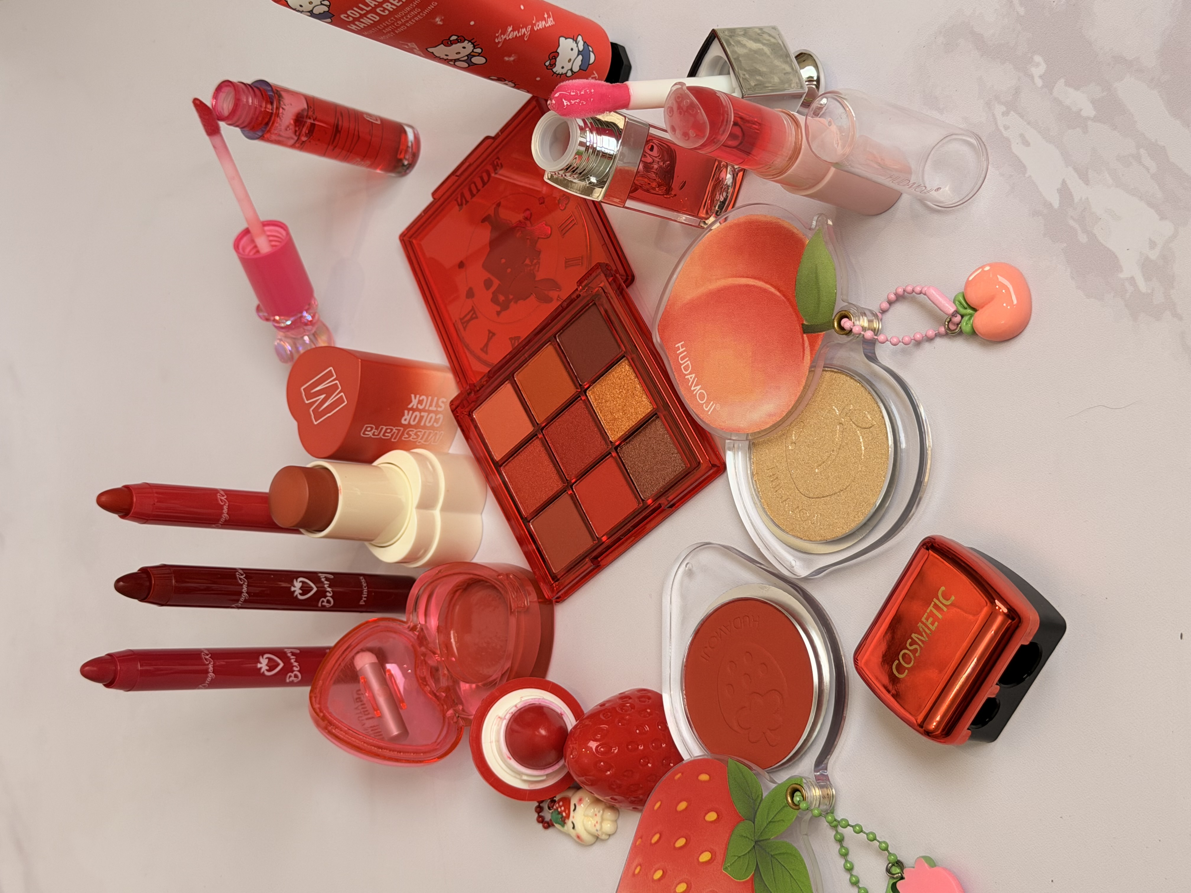 خرید پک آرایشی تم قرمز شامل بالم لب قرمز و توتفرنگی، رژ لب استیکی، رژگونه توتفرنگی، هایلایتر طرح هلو، برق لب خرسی و مدل دیور، پالت سایه و کرم مرطوبکننده. ست فانتزی، خوشبو و مناسب هدیه تولد.
