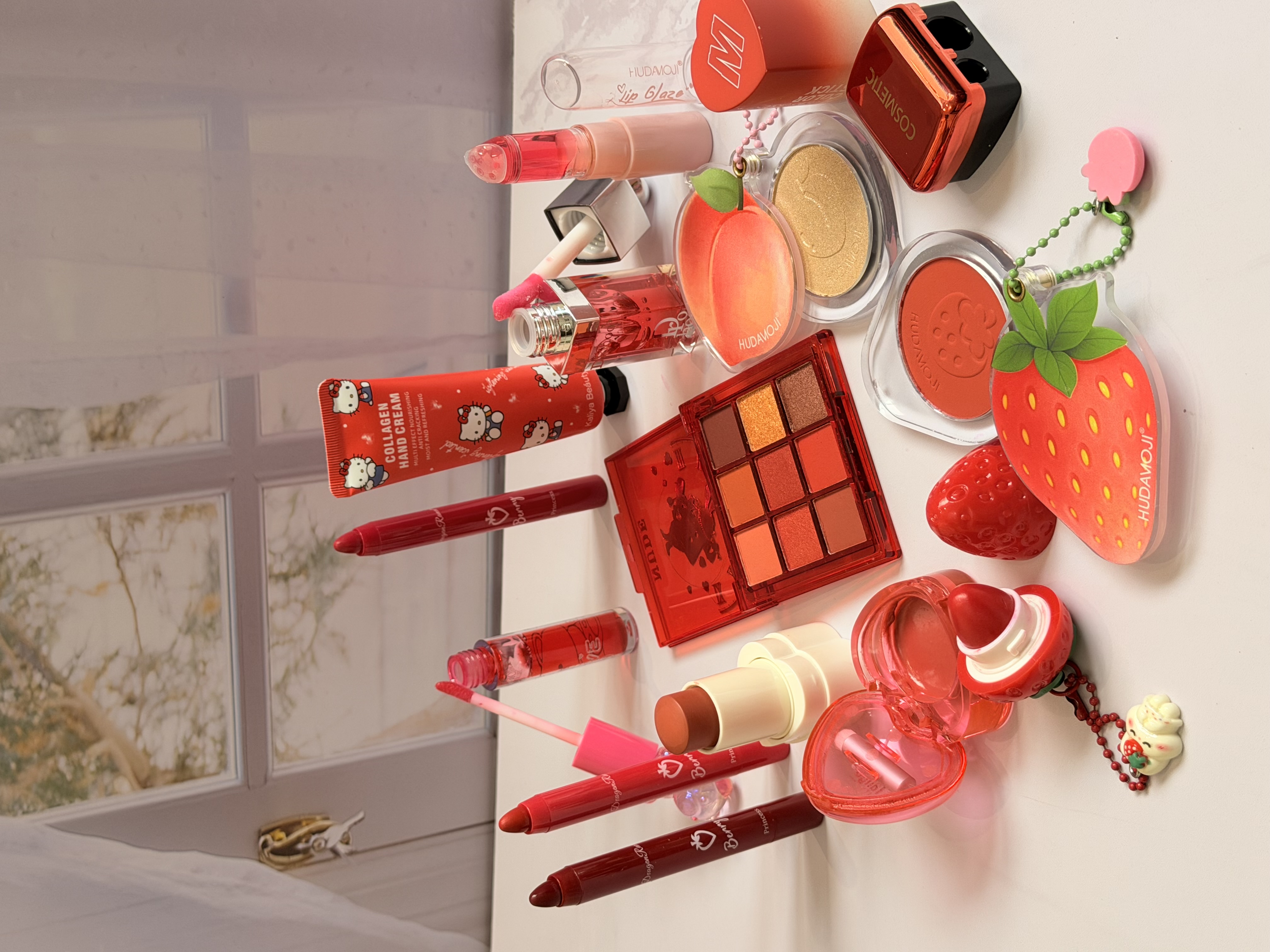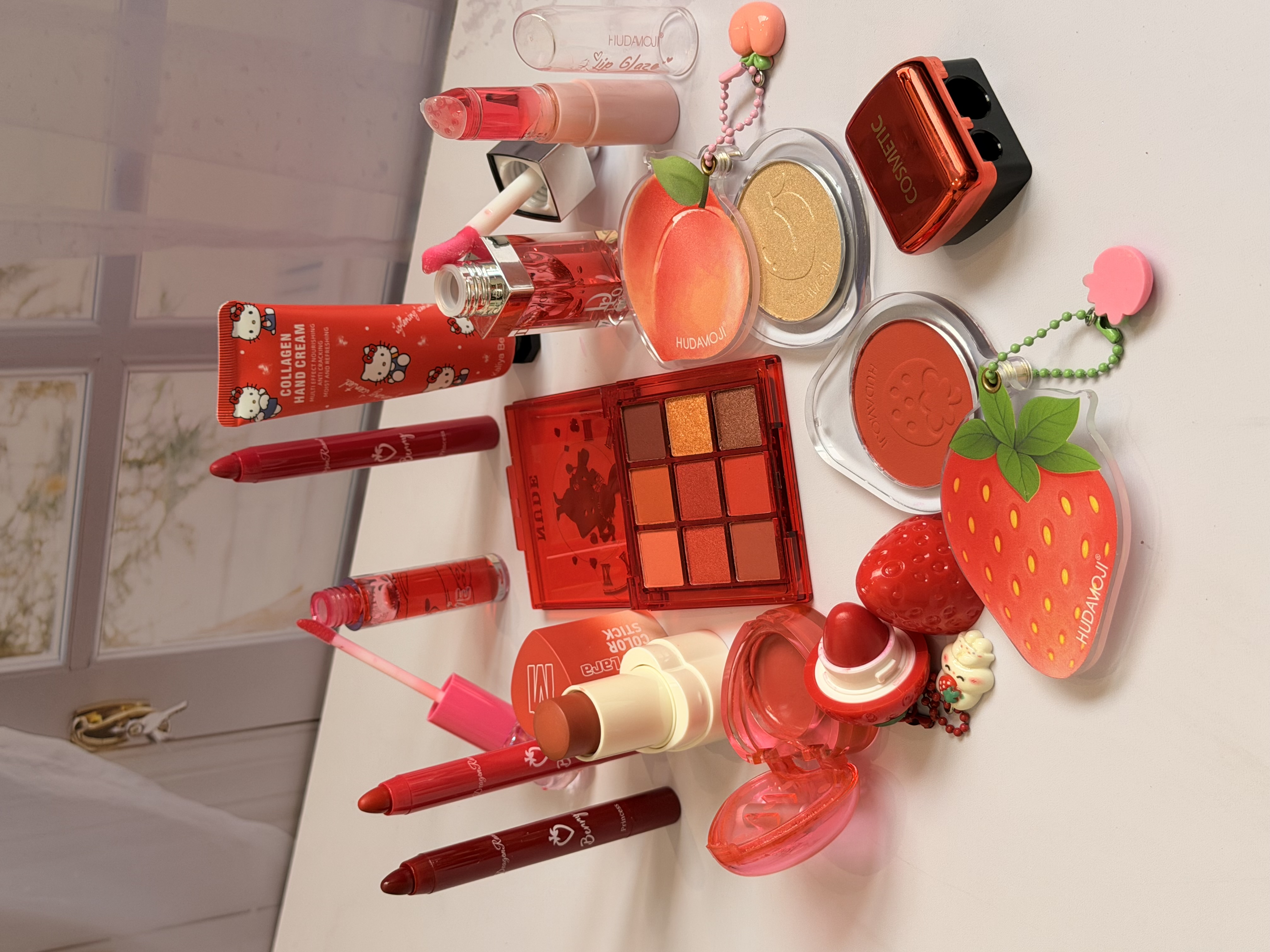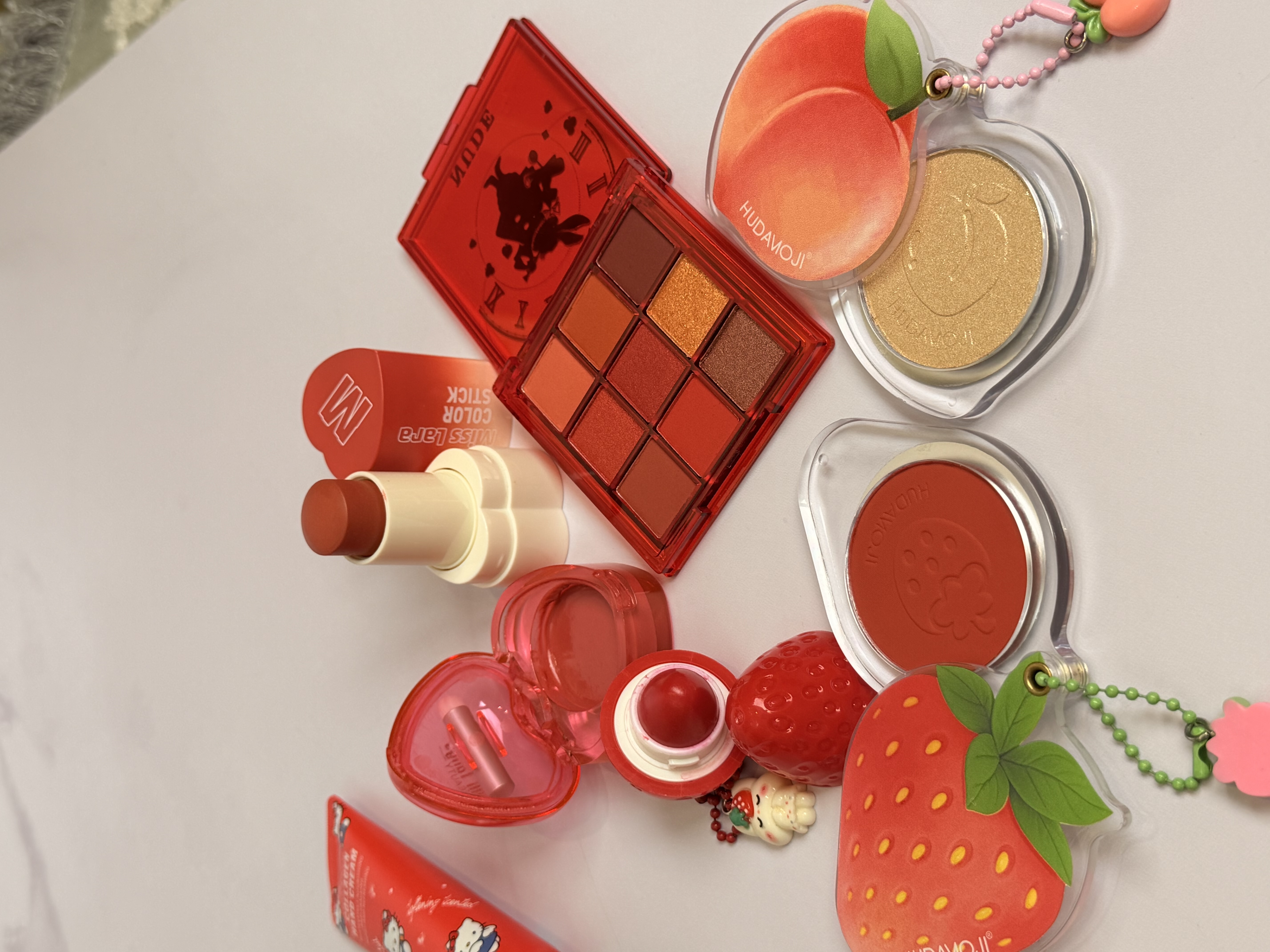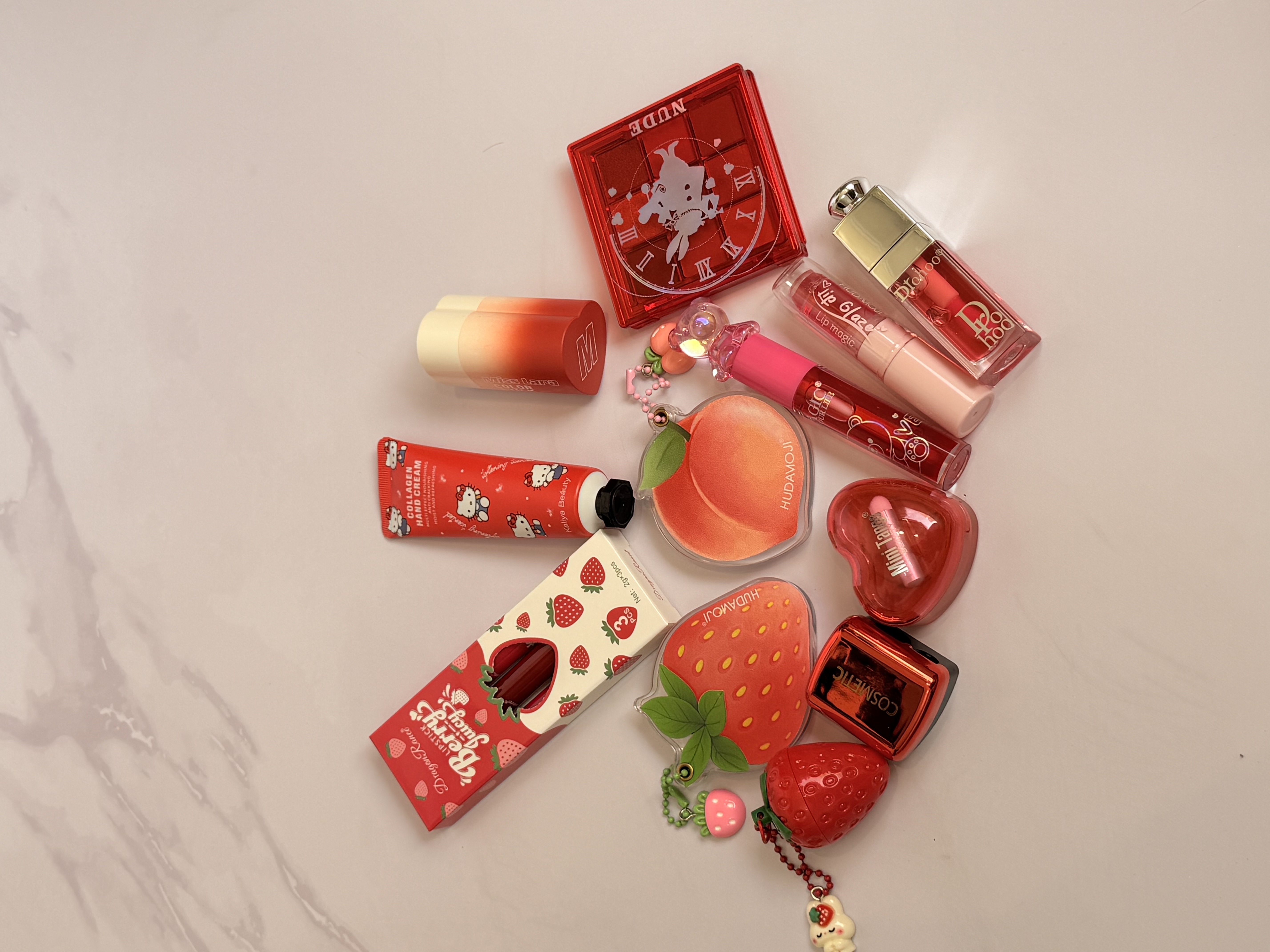 خرید پک آرایشی تم قرمز شامل بالم لب قرمز و توتفرنگی، رژ لب استیکی، رژگونه توتفرنگی، هایلایتر طرح هلو، برق لب خرسی و مدل دیور، پالت سایه و کرم مرطوبکننده. ست فانتزی، خوشبو و مناسب هدیه تولد.