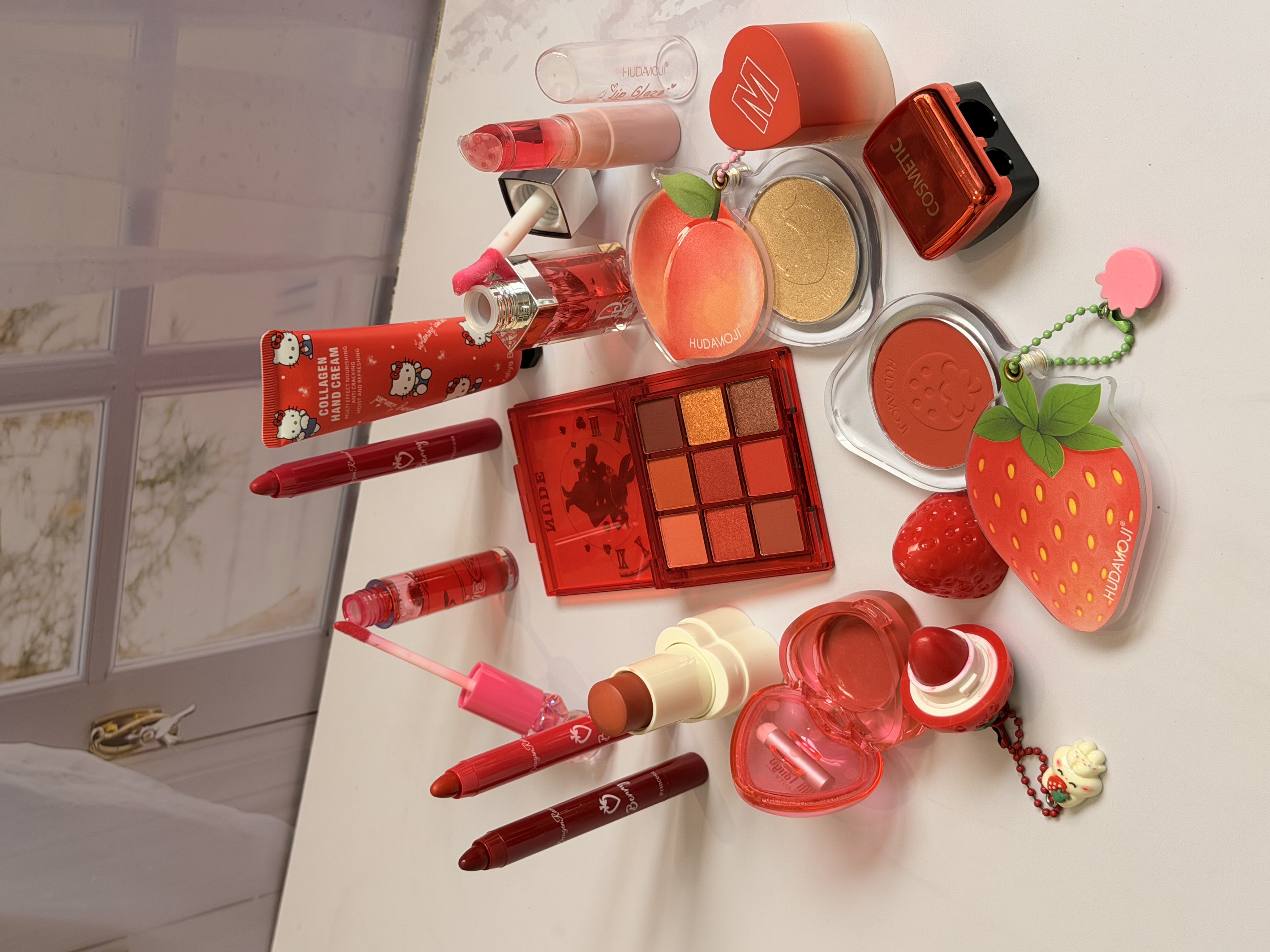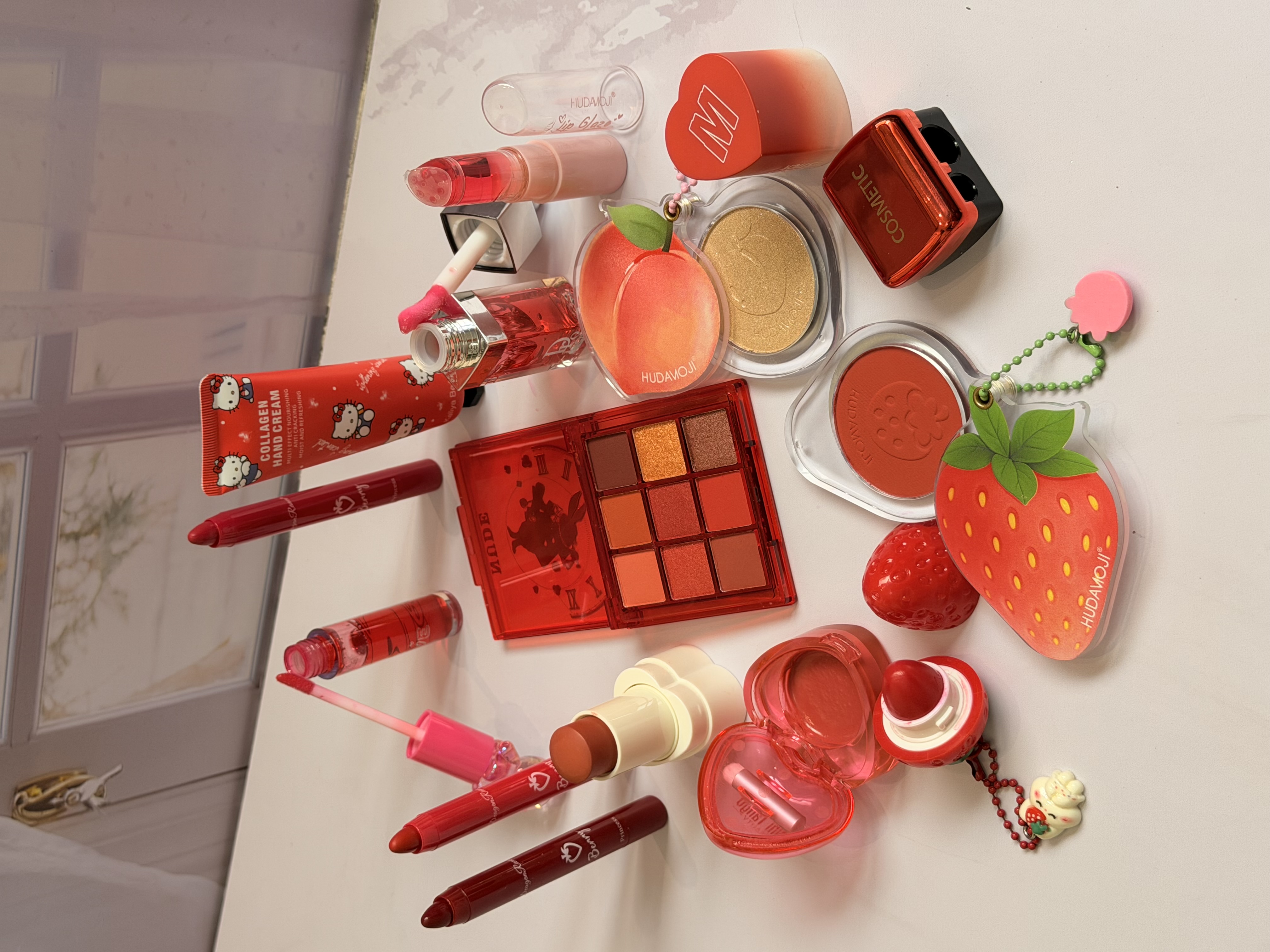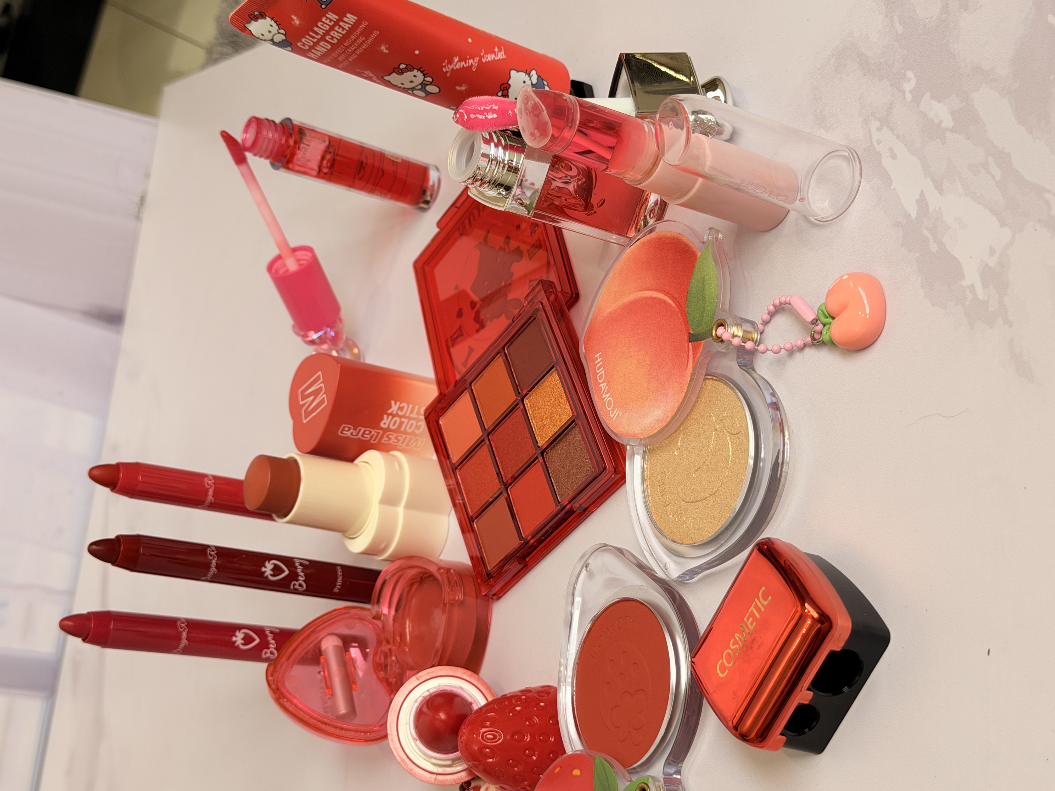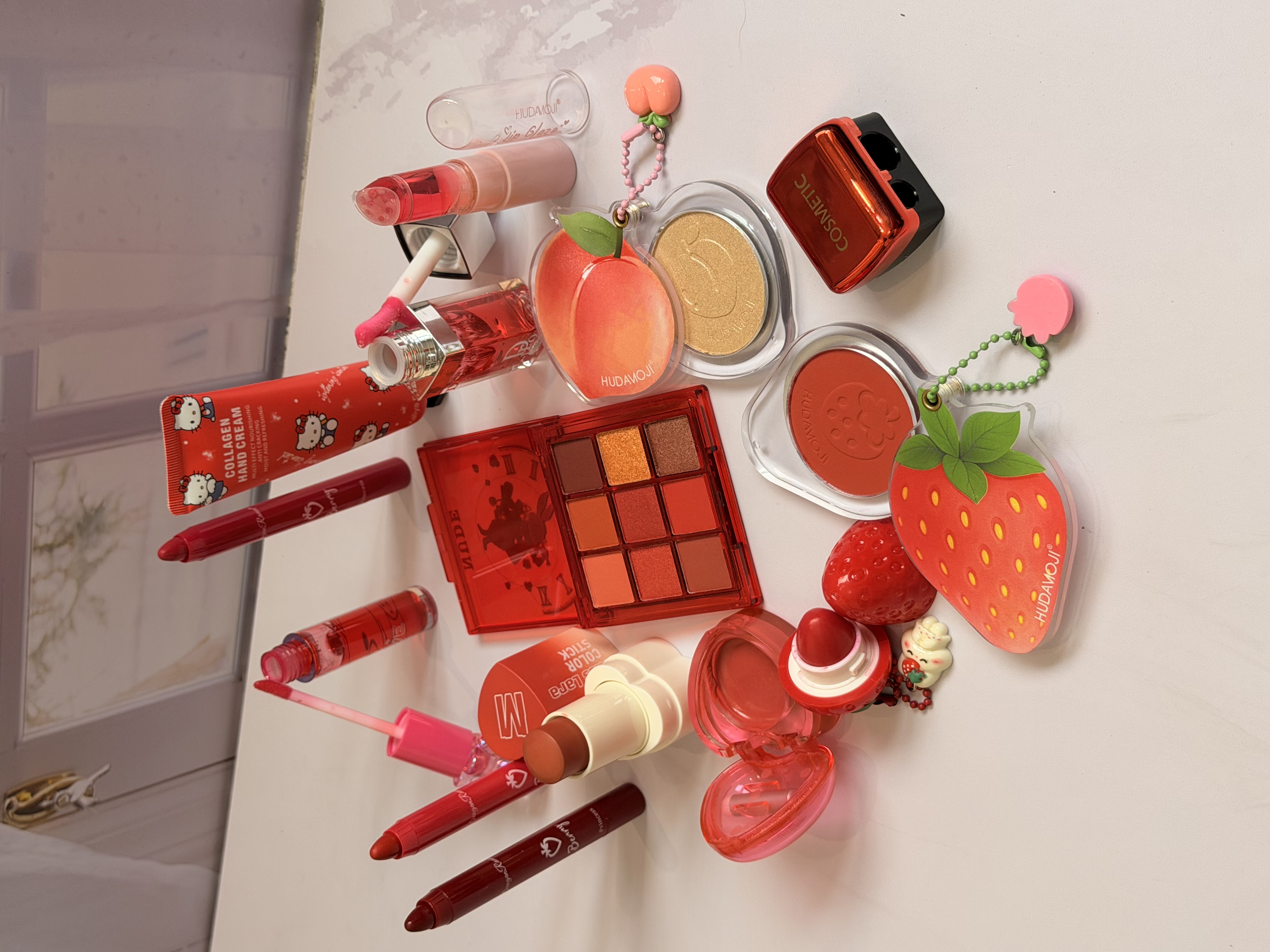 خرید پک آرایشی تم قرمز شامل بالم لب قرمز و توتفرنگی، رژ لب استیکی، رژگونه توتفرنگی، هایلایتر طرح هلو، برق لب خرسی و مدل دیور، پالت سایه و کرم مرطوبکننده. ست فانتزی، خوشبو و مناسب هدیه تولد.