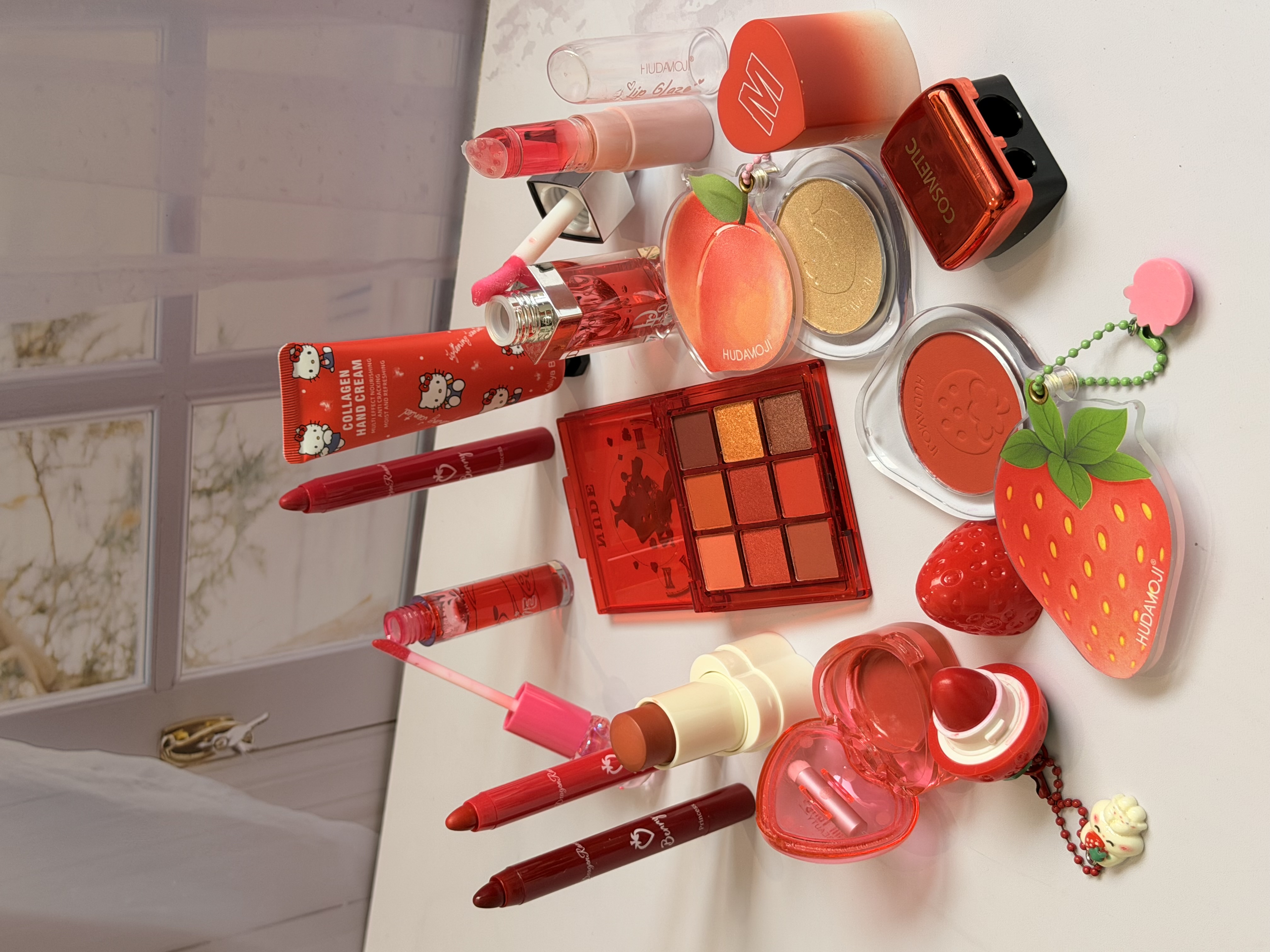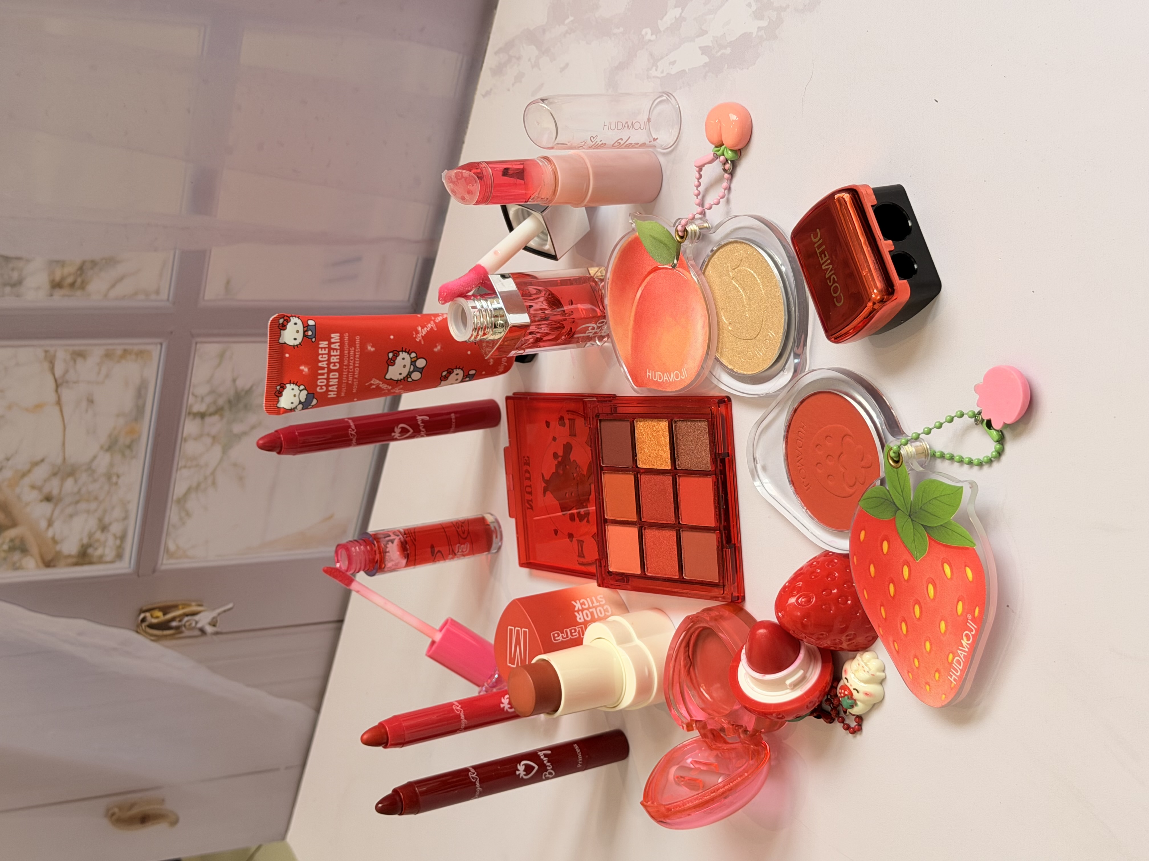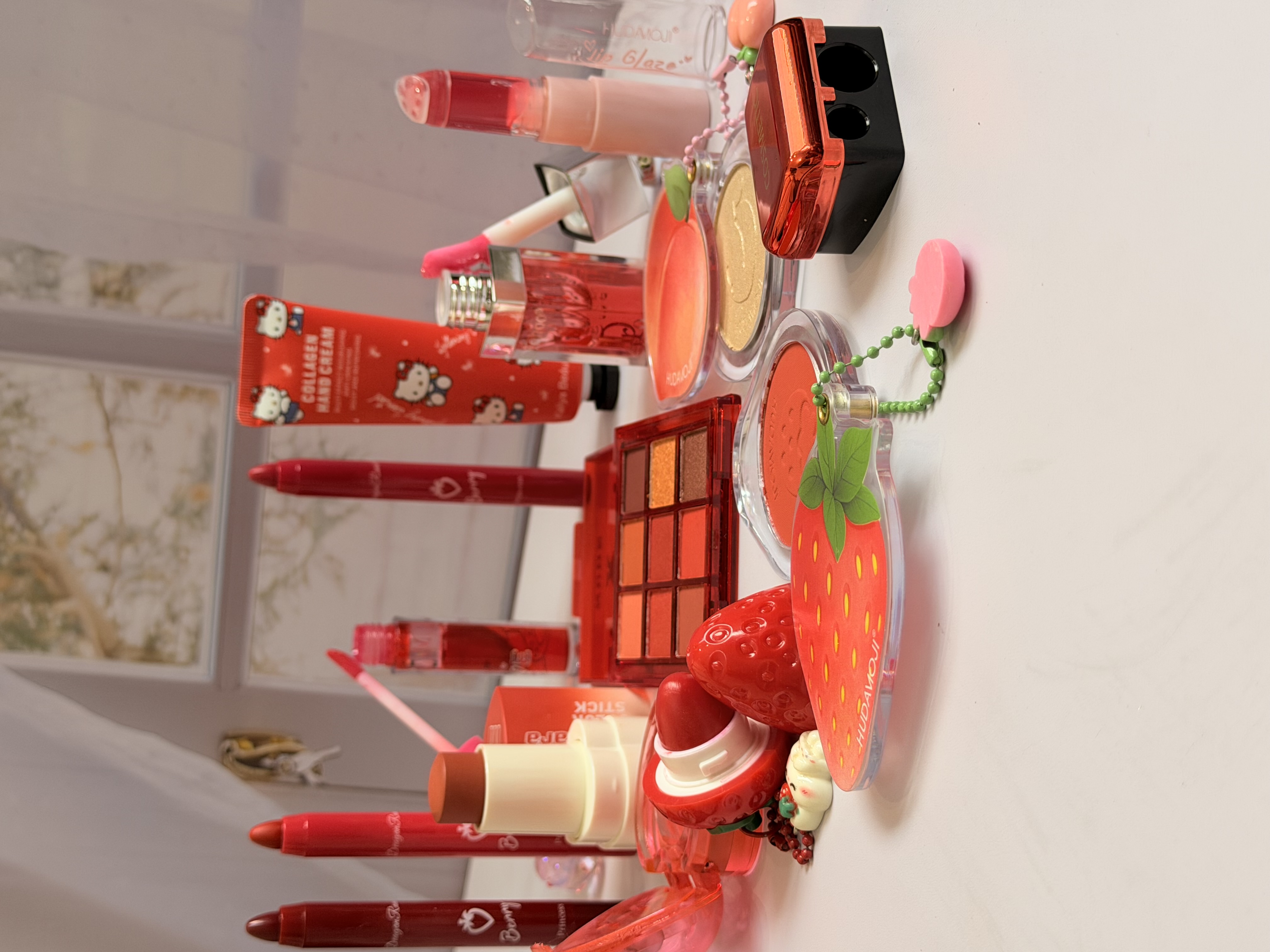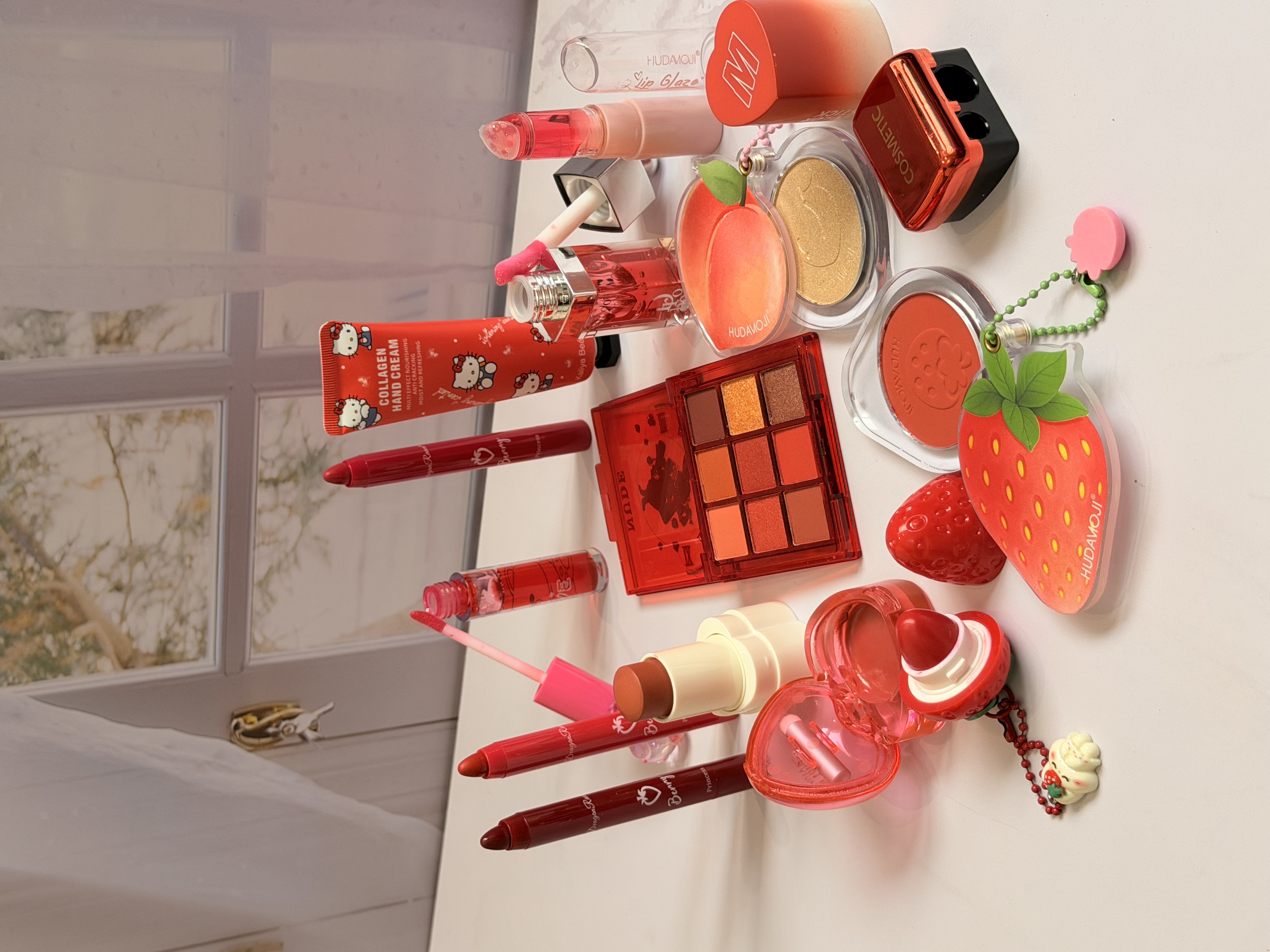 خرید پک آرایشی تم قرمز شامل بالم لب قرمز و توتفرنگی، رژ لب استیکی، رژگونه توتفرنگی، هایلایتر طرح هلو، برق لب خرسی و مدل دیور، پالت سایه و کرم مرطوبکننده. ست فانتزی، خوشبو و مناسب هدیه تولد.