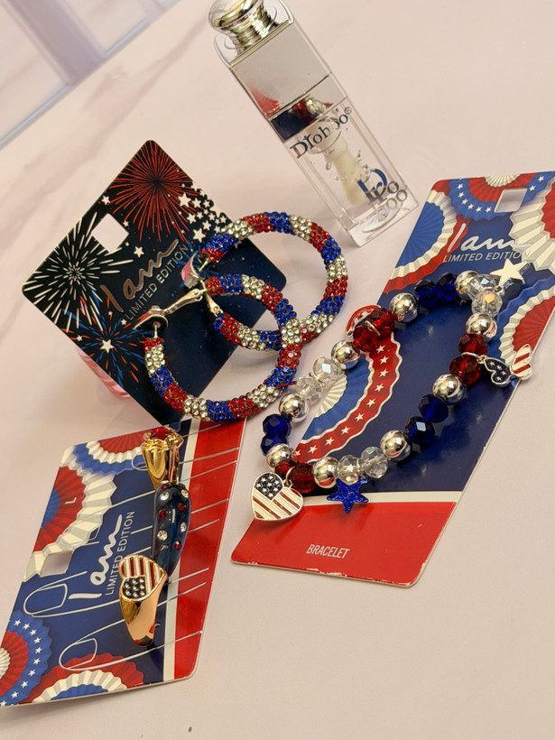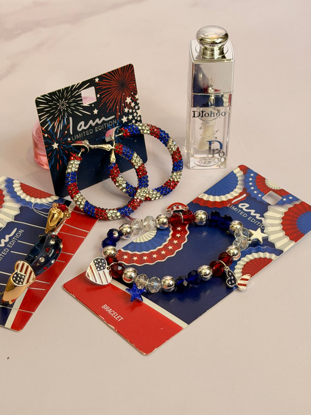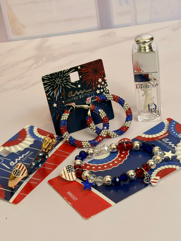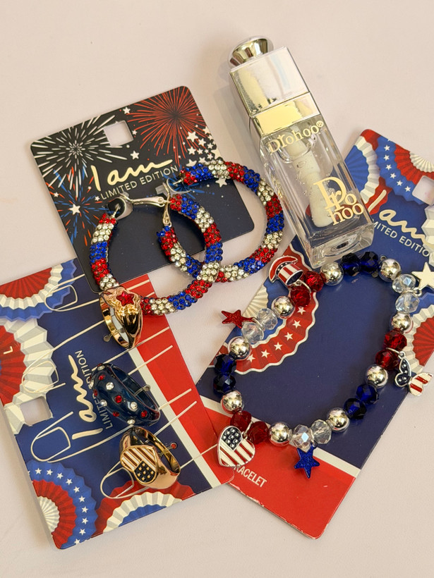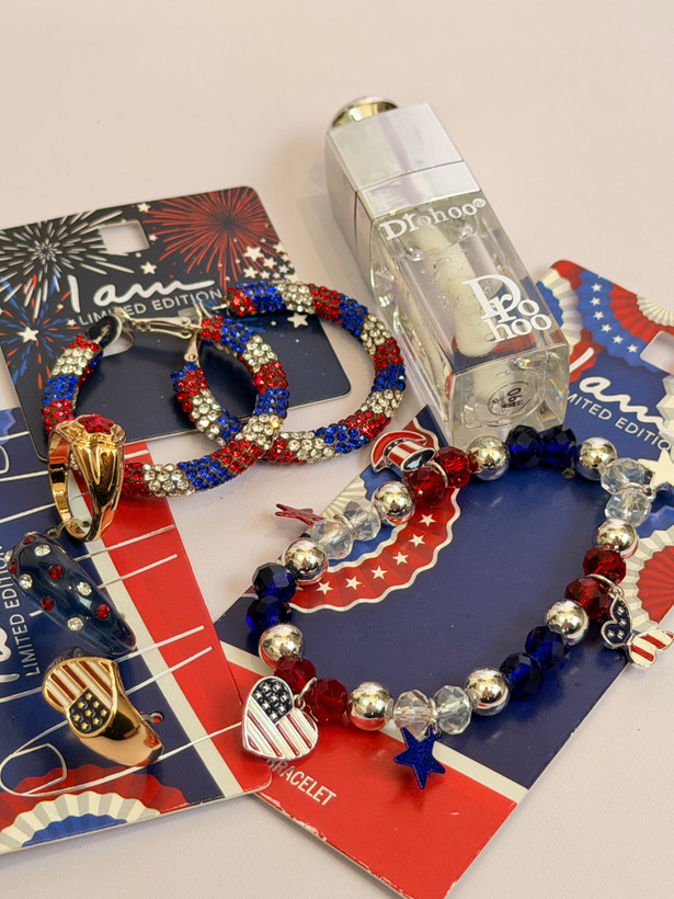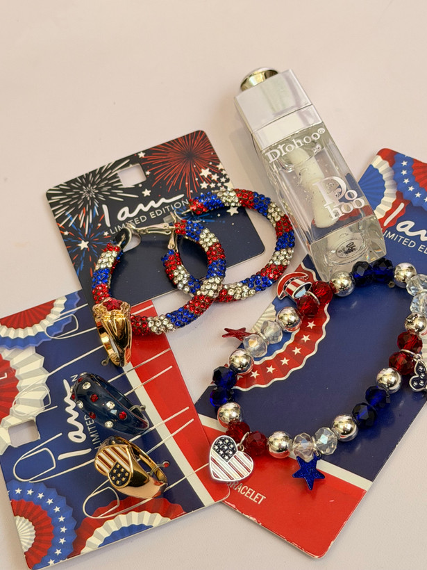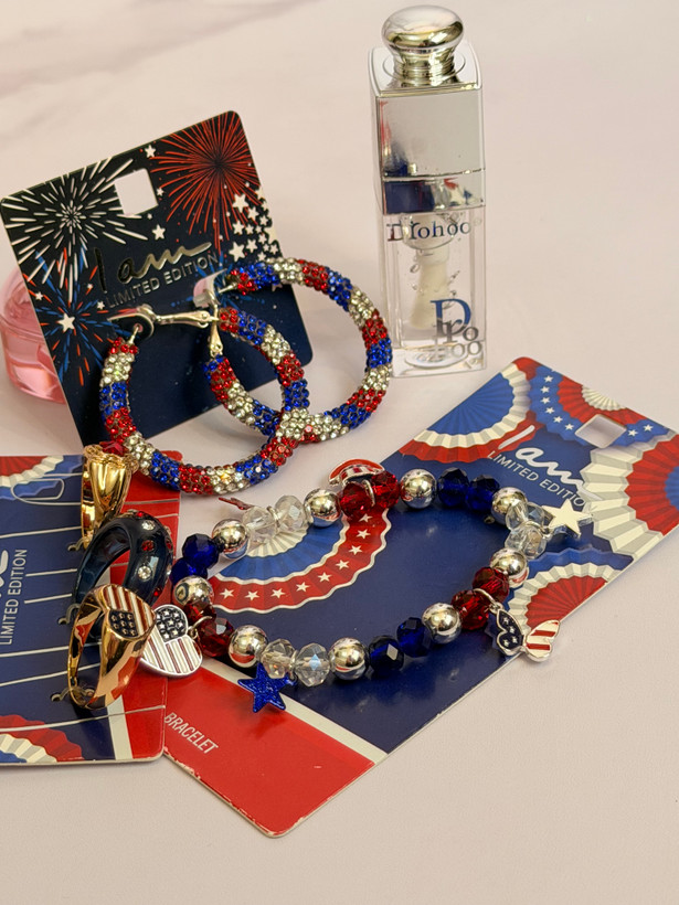 ست کامل زیورآلات مدل پرچم امریکا | پک دستبند انگشتر گوشواره + برق لب طرح Dior هدیه خاص دخترانه