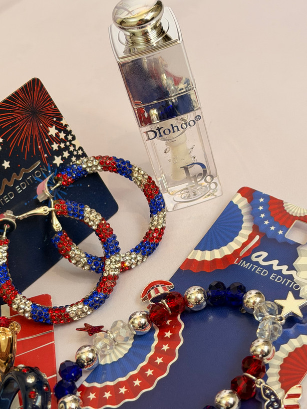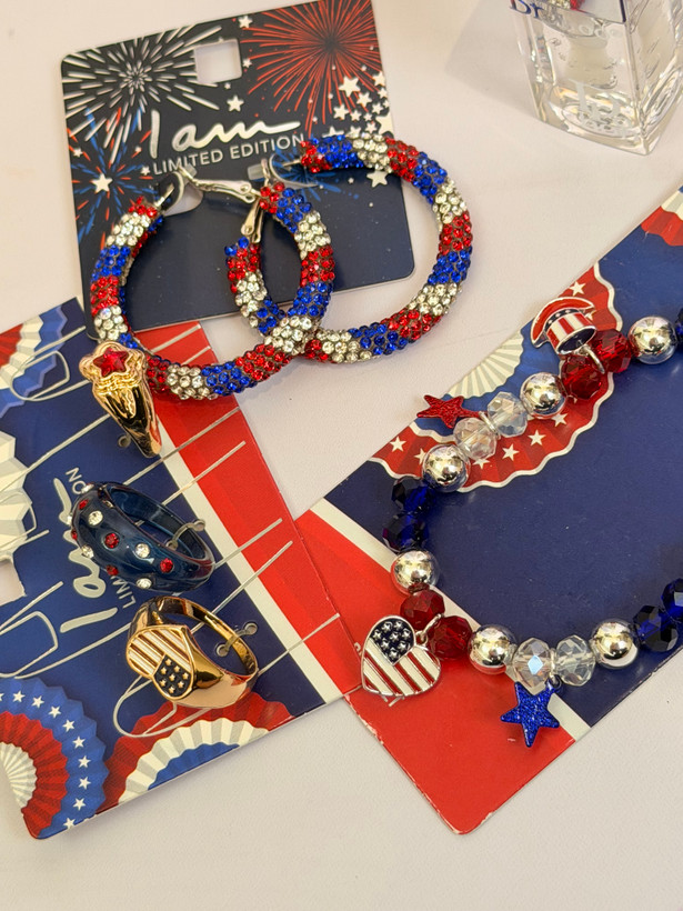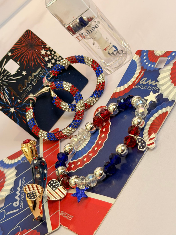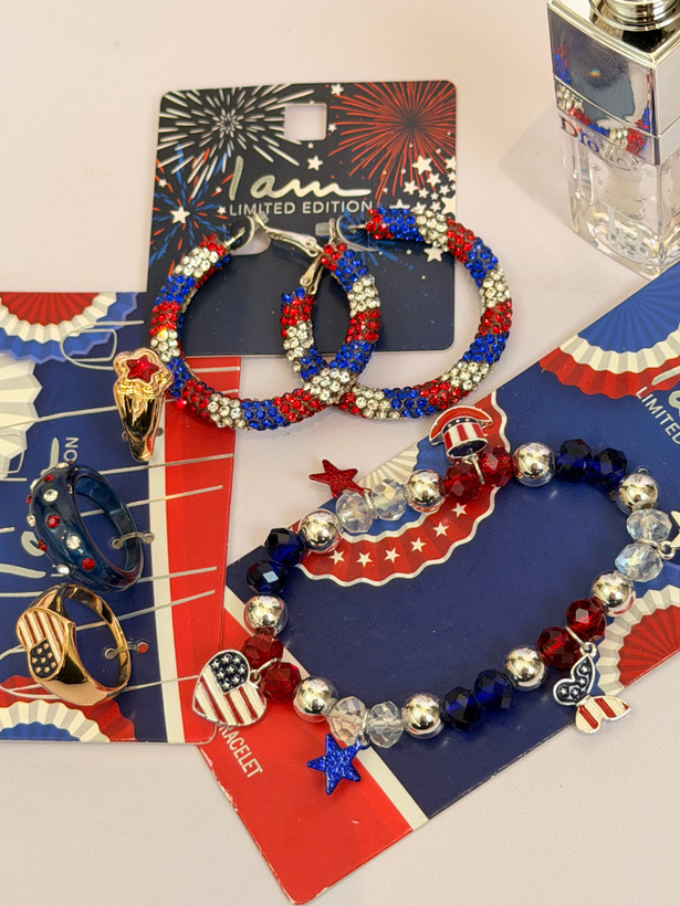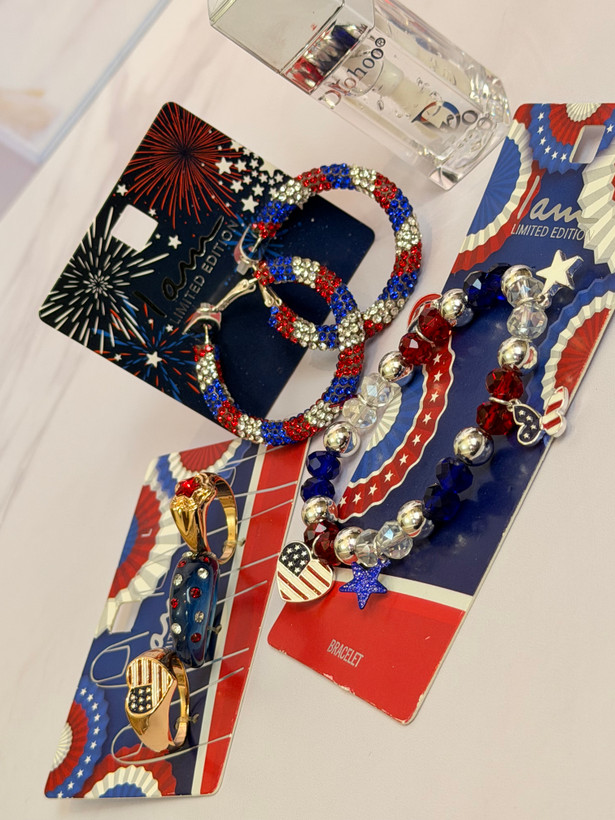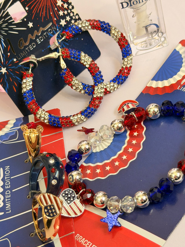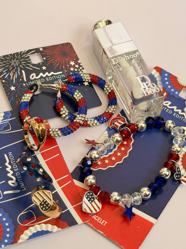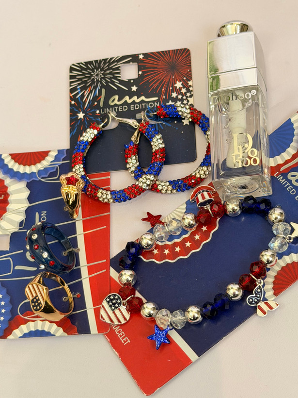 ست کامل زیورآلات مدل پرچم امریکا | پک دستبند انگشتر گوشواره + برق لب طرح Dior هدیه خاص دخترانه