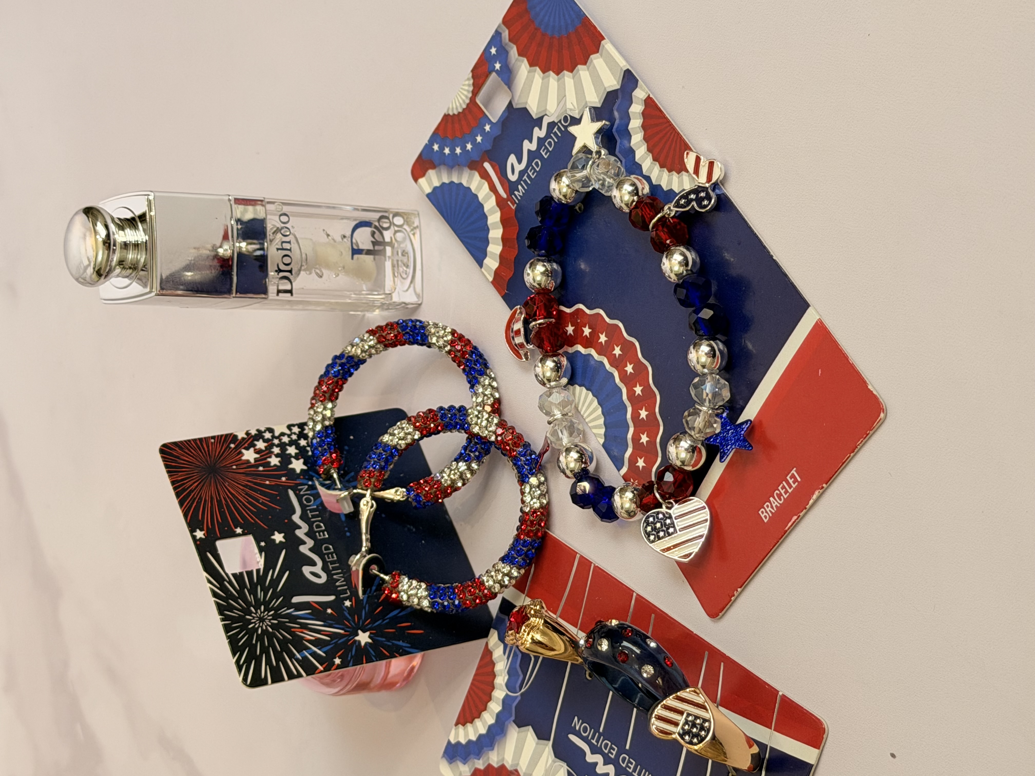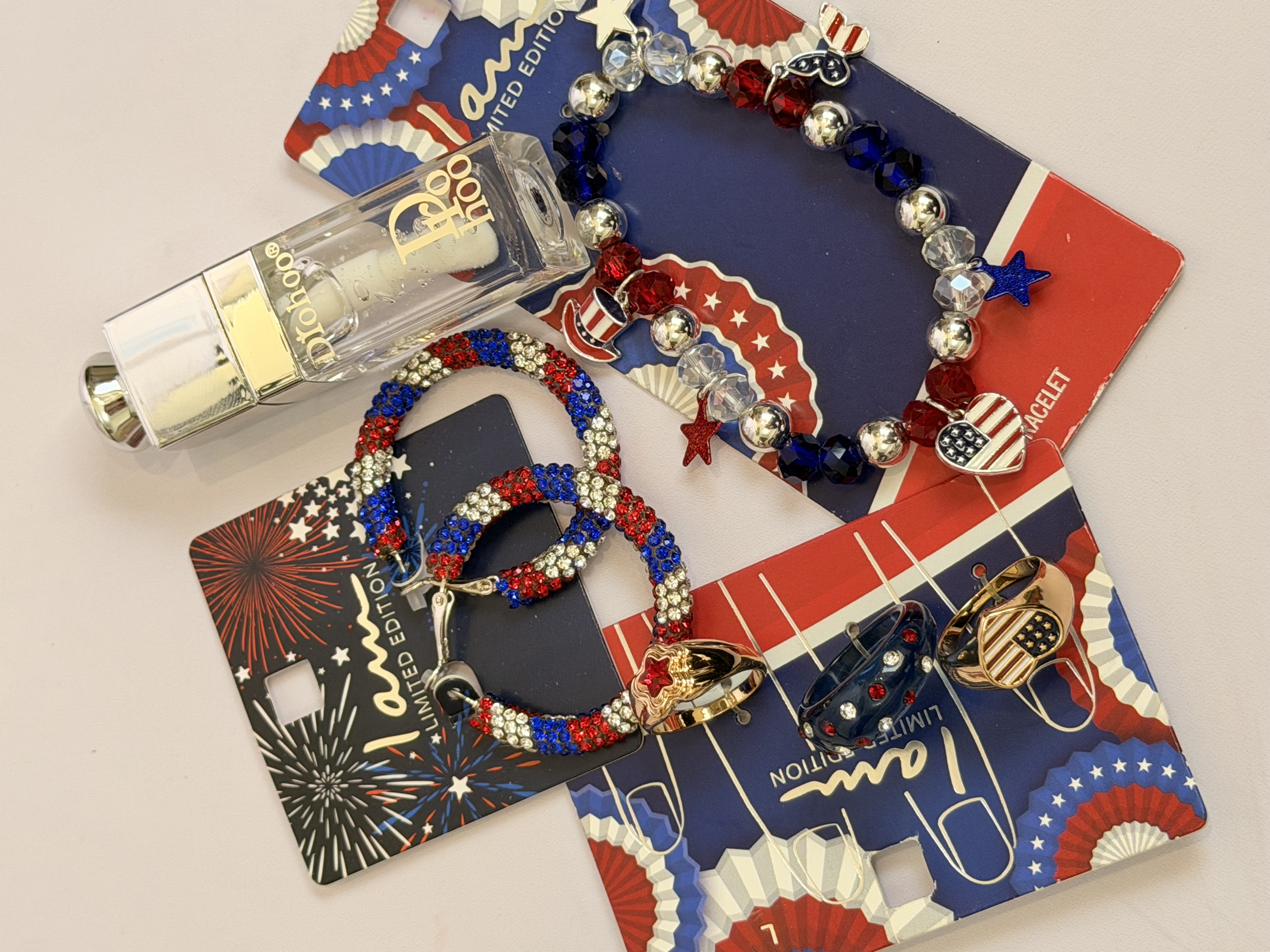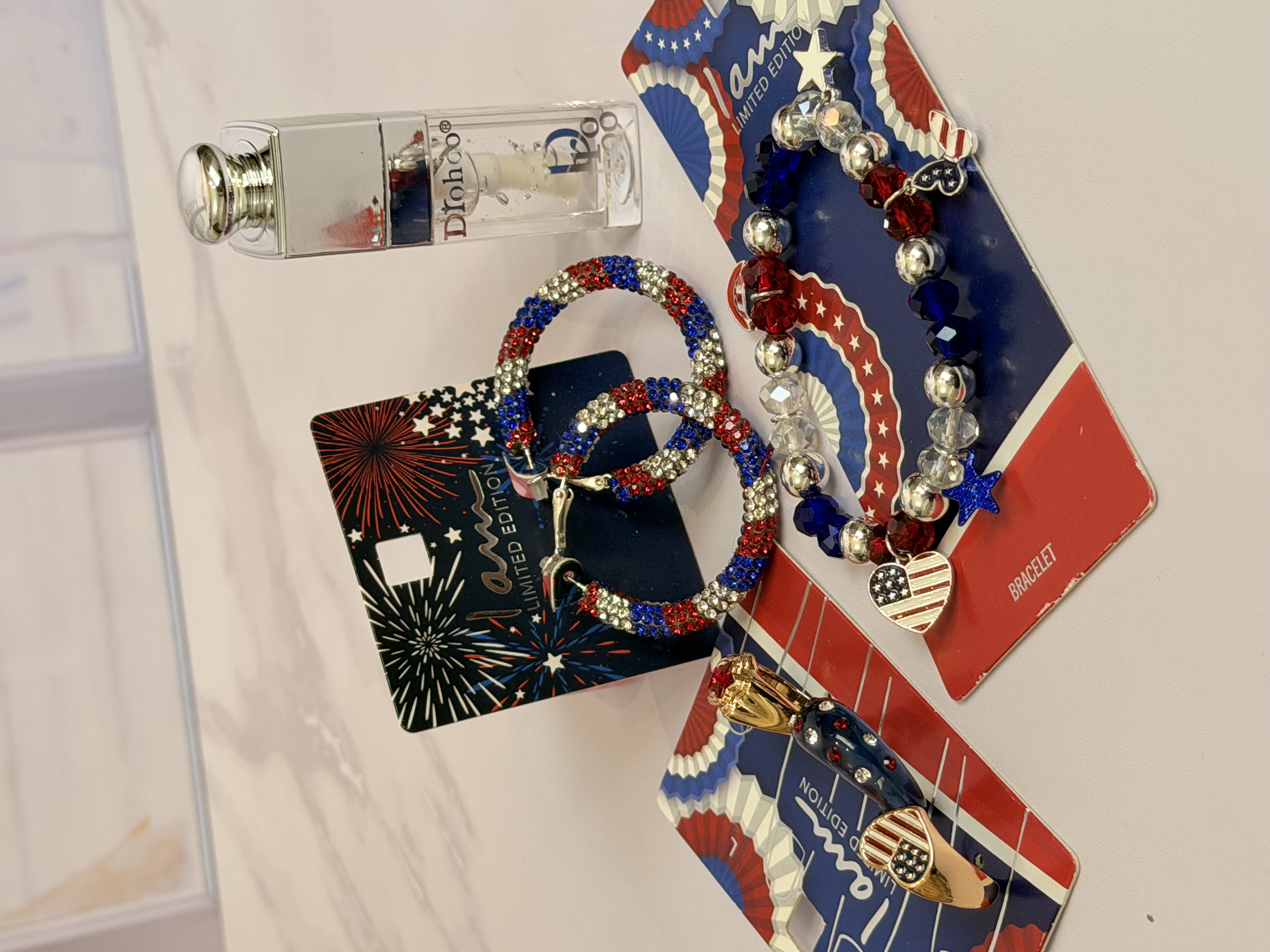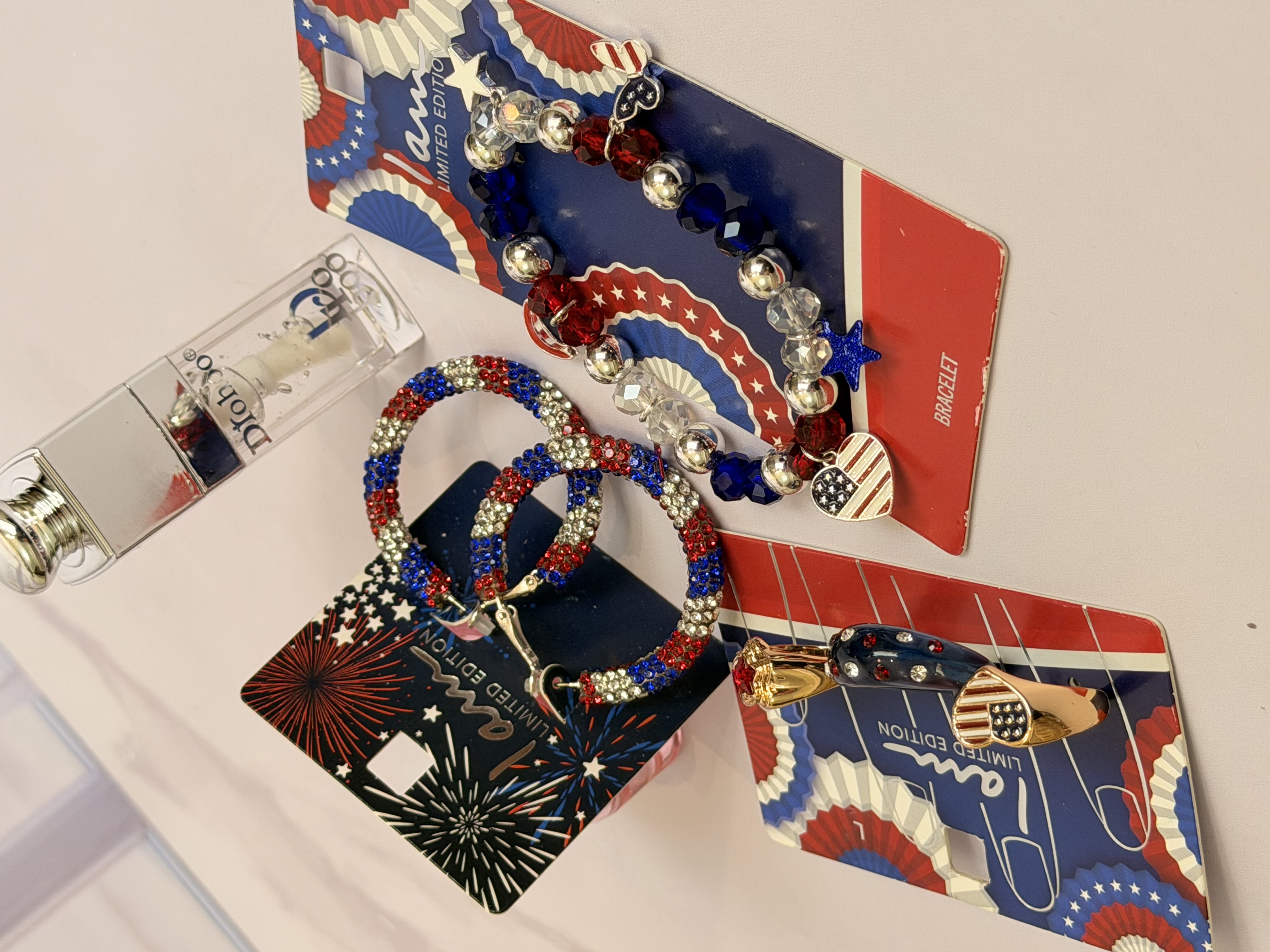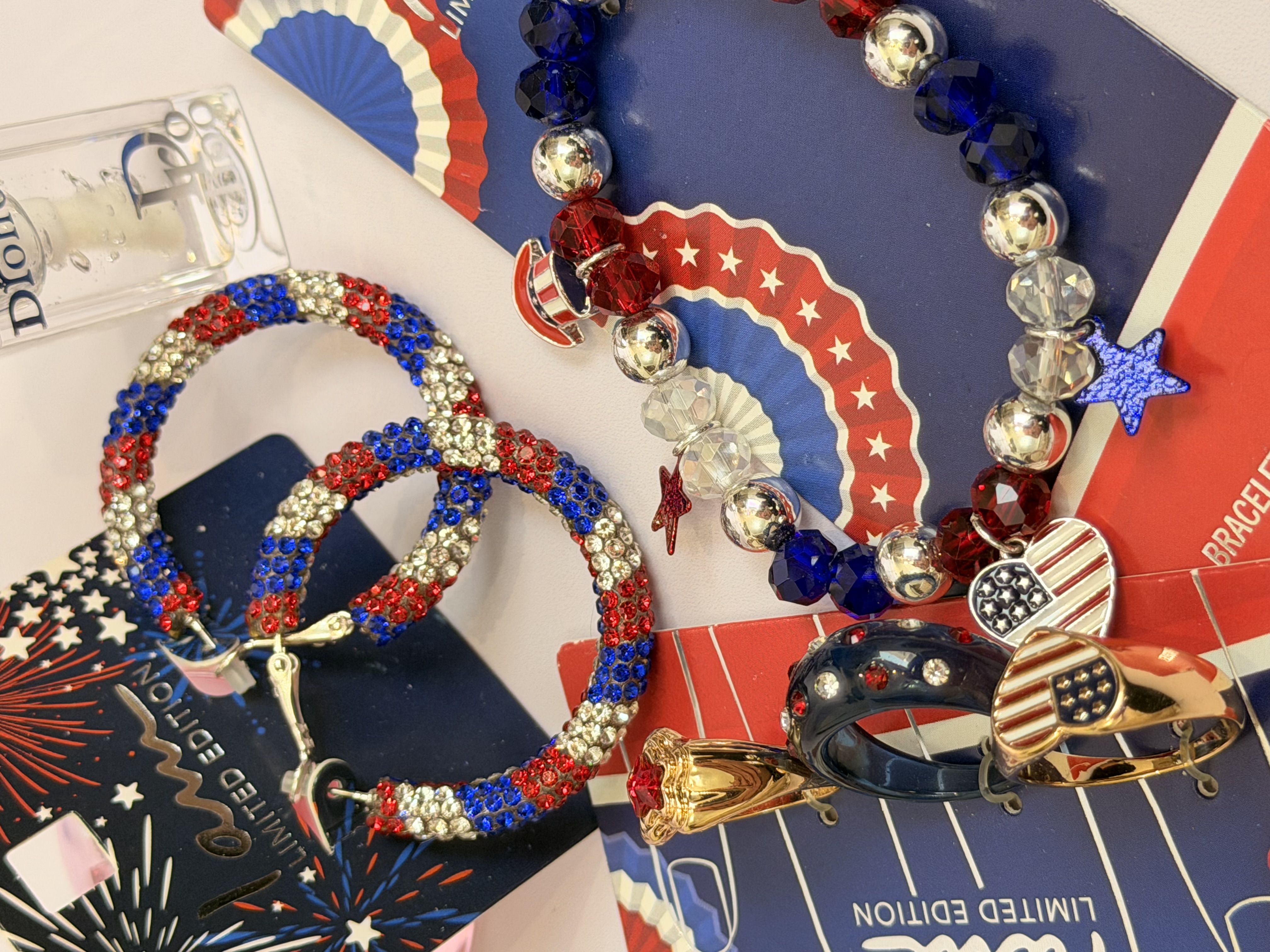ست کامل زیورآلات مدل پرچم امریکا | پک دستبند انگشتر گوشواره + برق لب طرح Dior هدیه خاص دخترانه