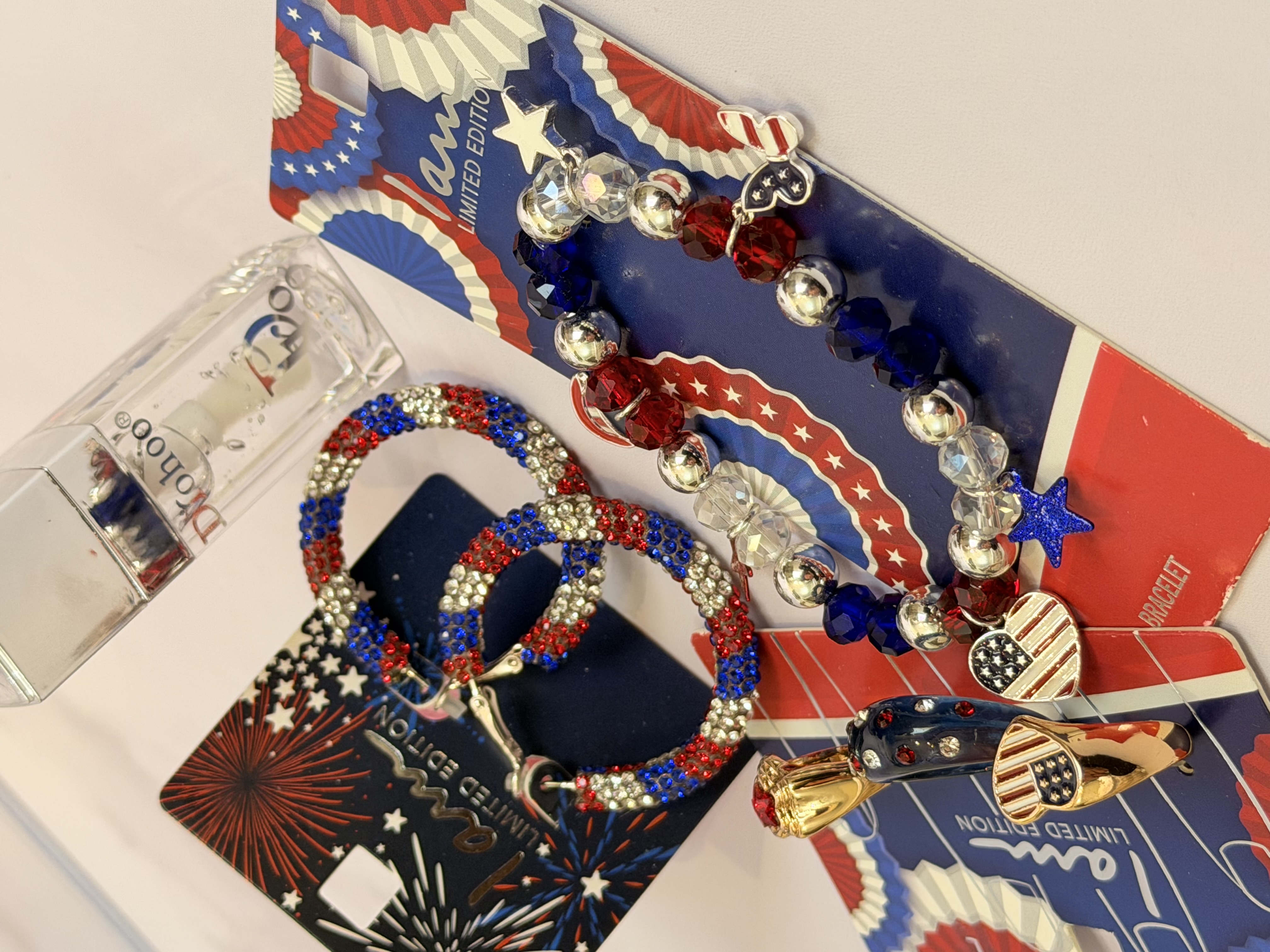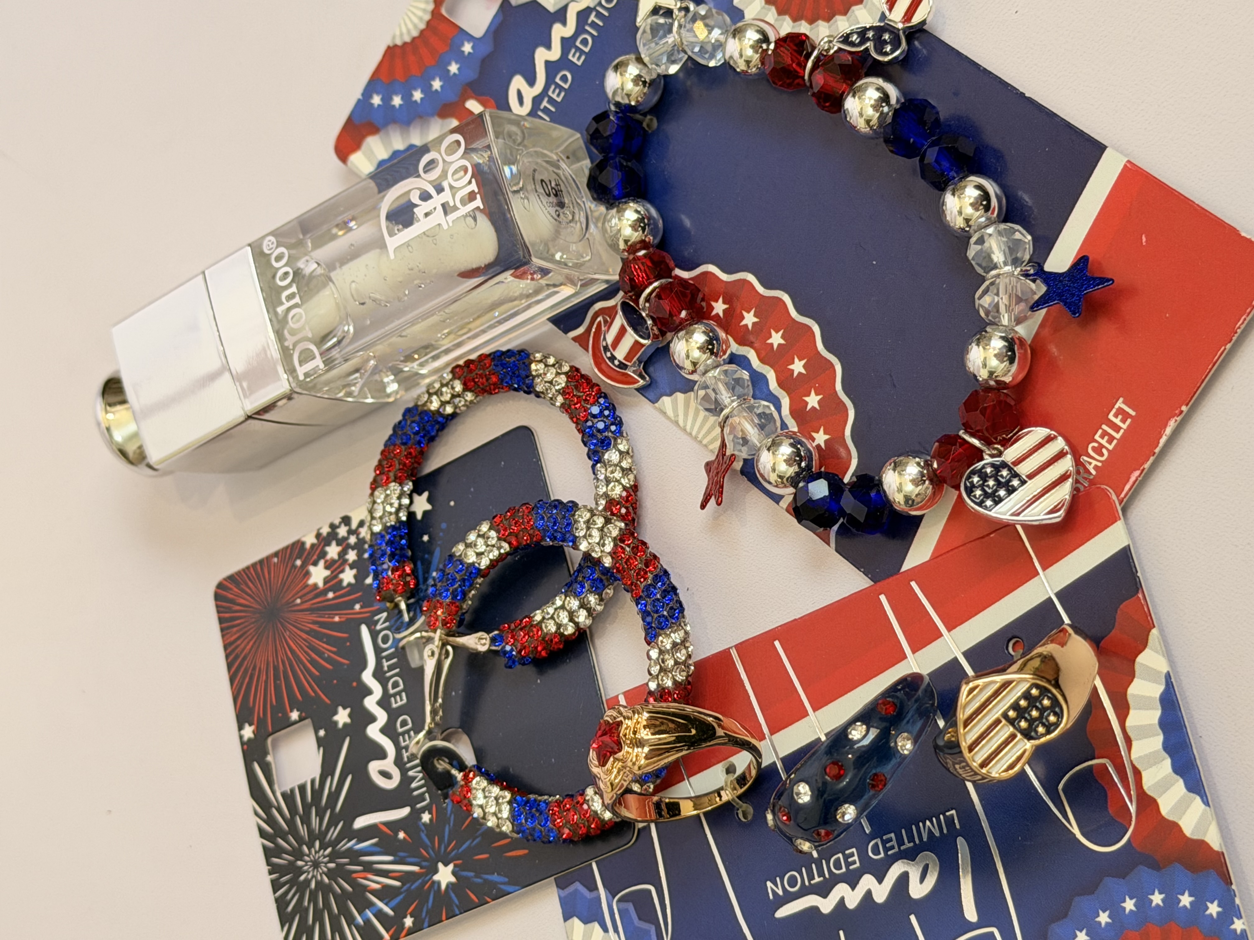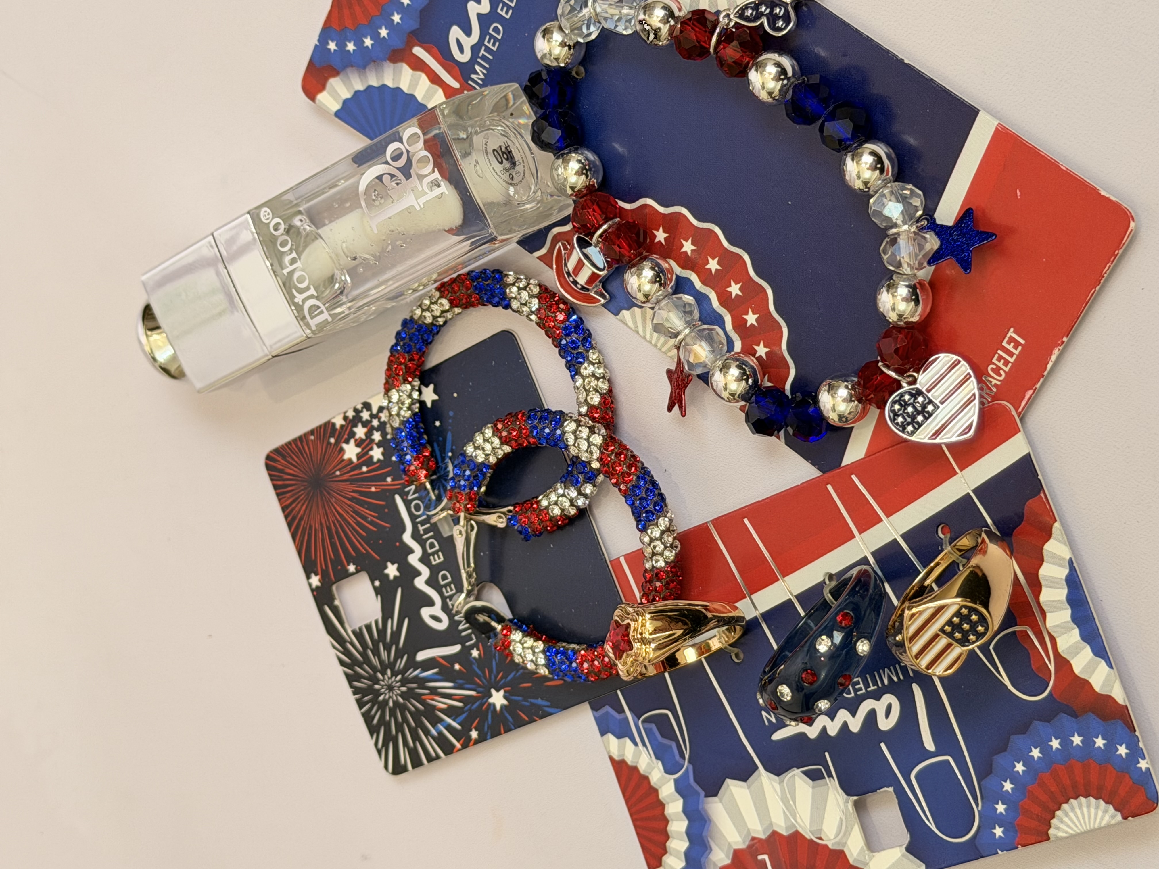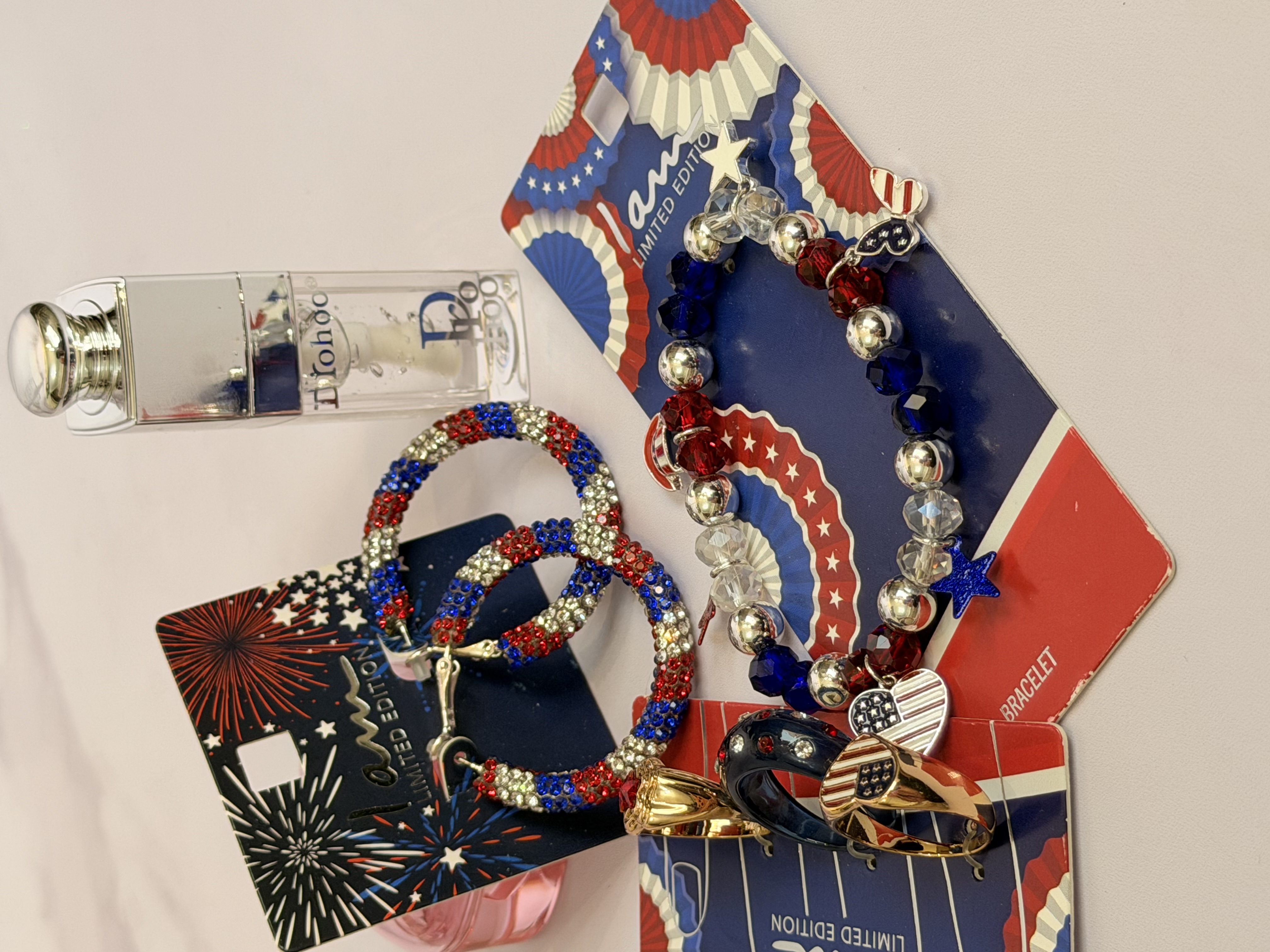 ست کامل زیورآلات مدل پرچم امریکا | پک دستبند انگشتر گوشواره + برق لب طرح Dior هدیه خاص دخترانه