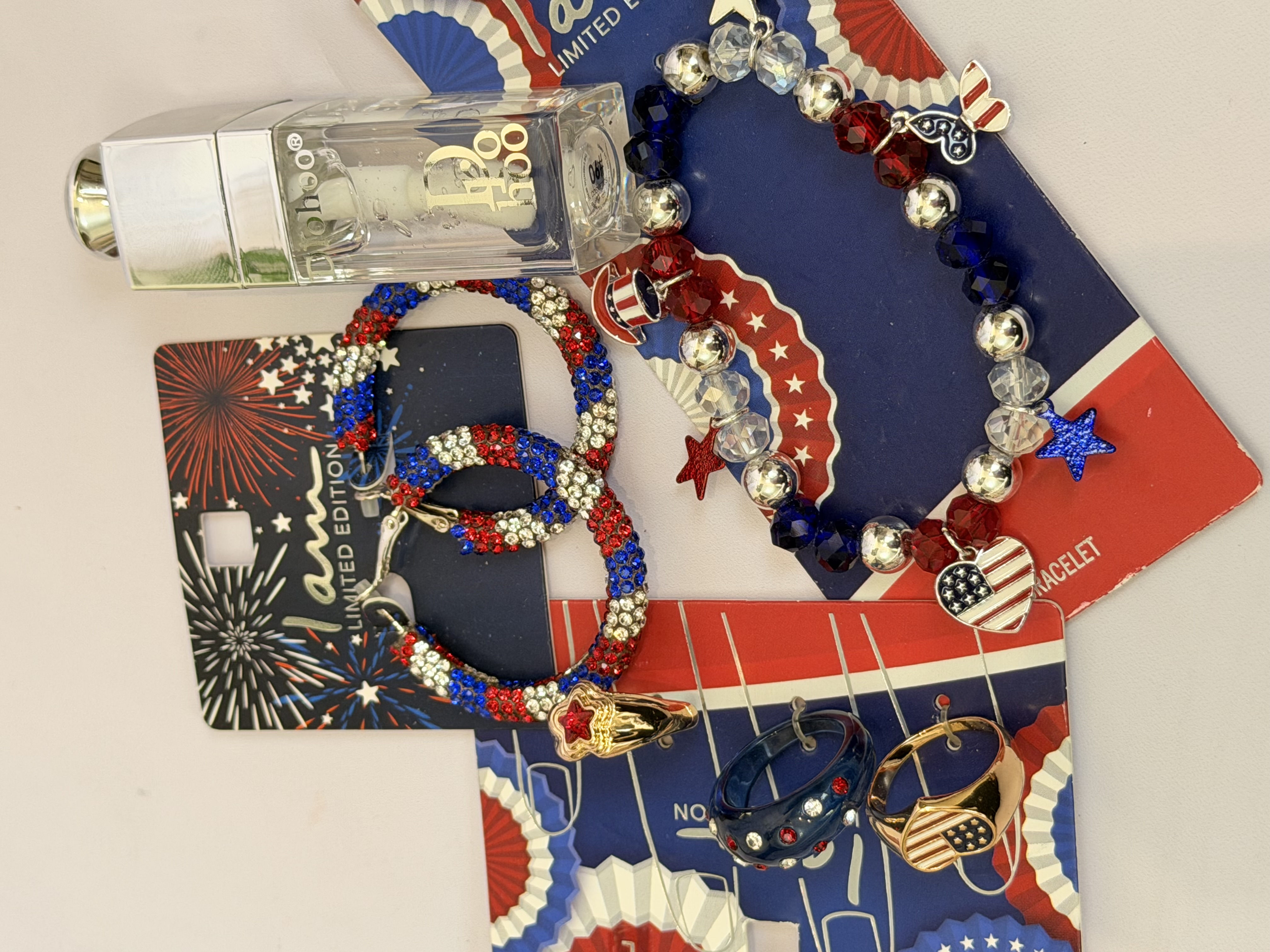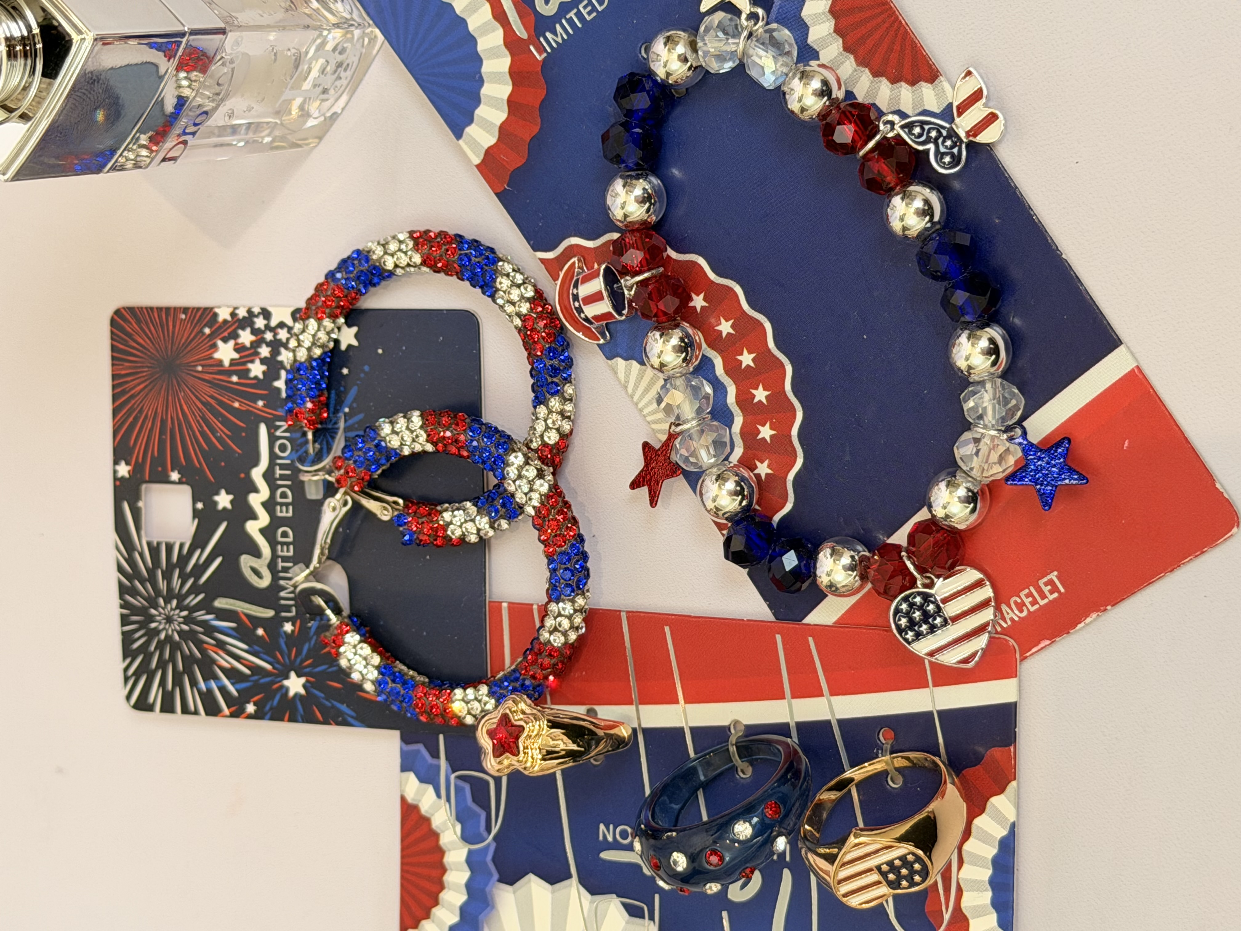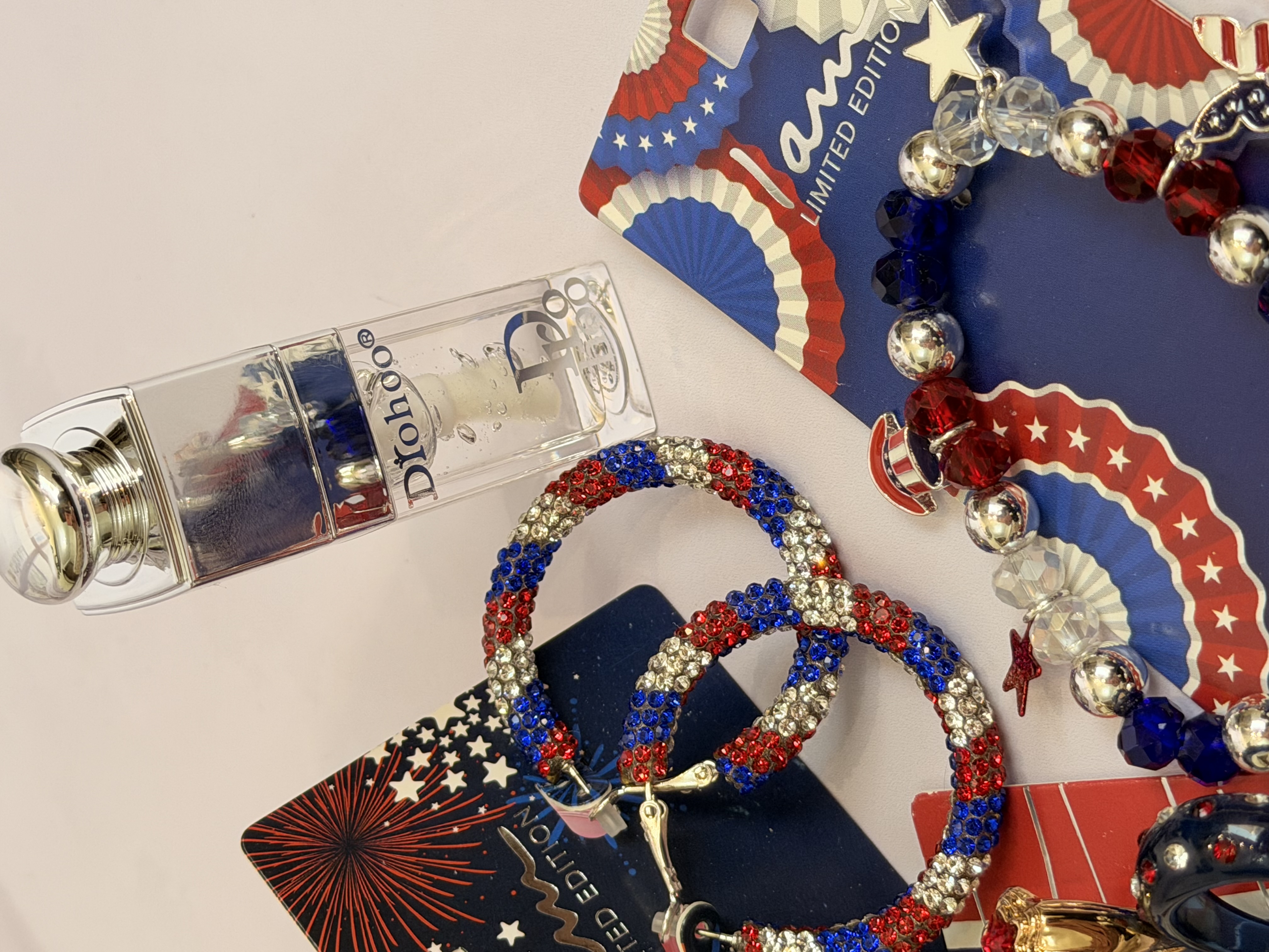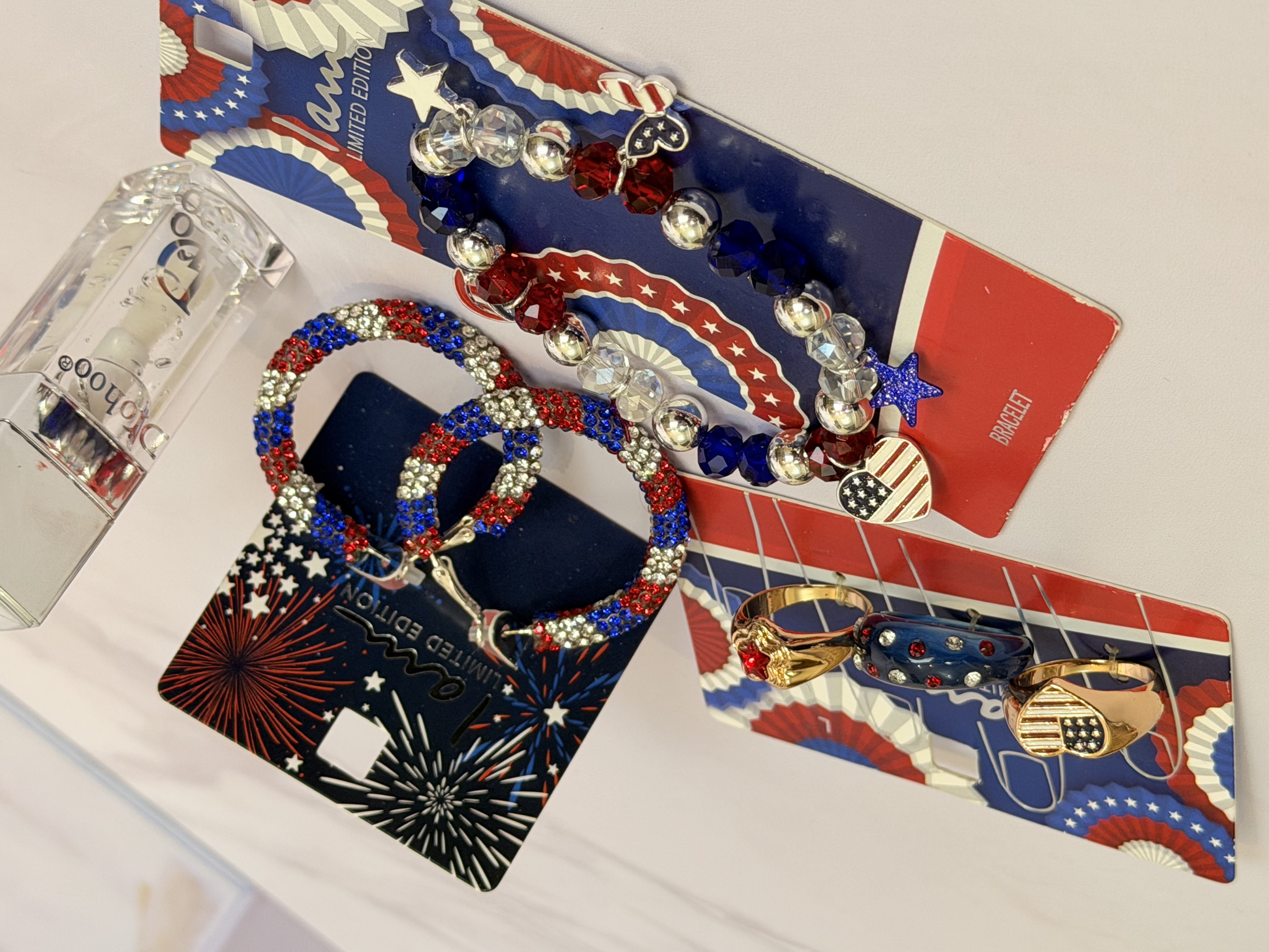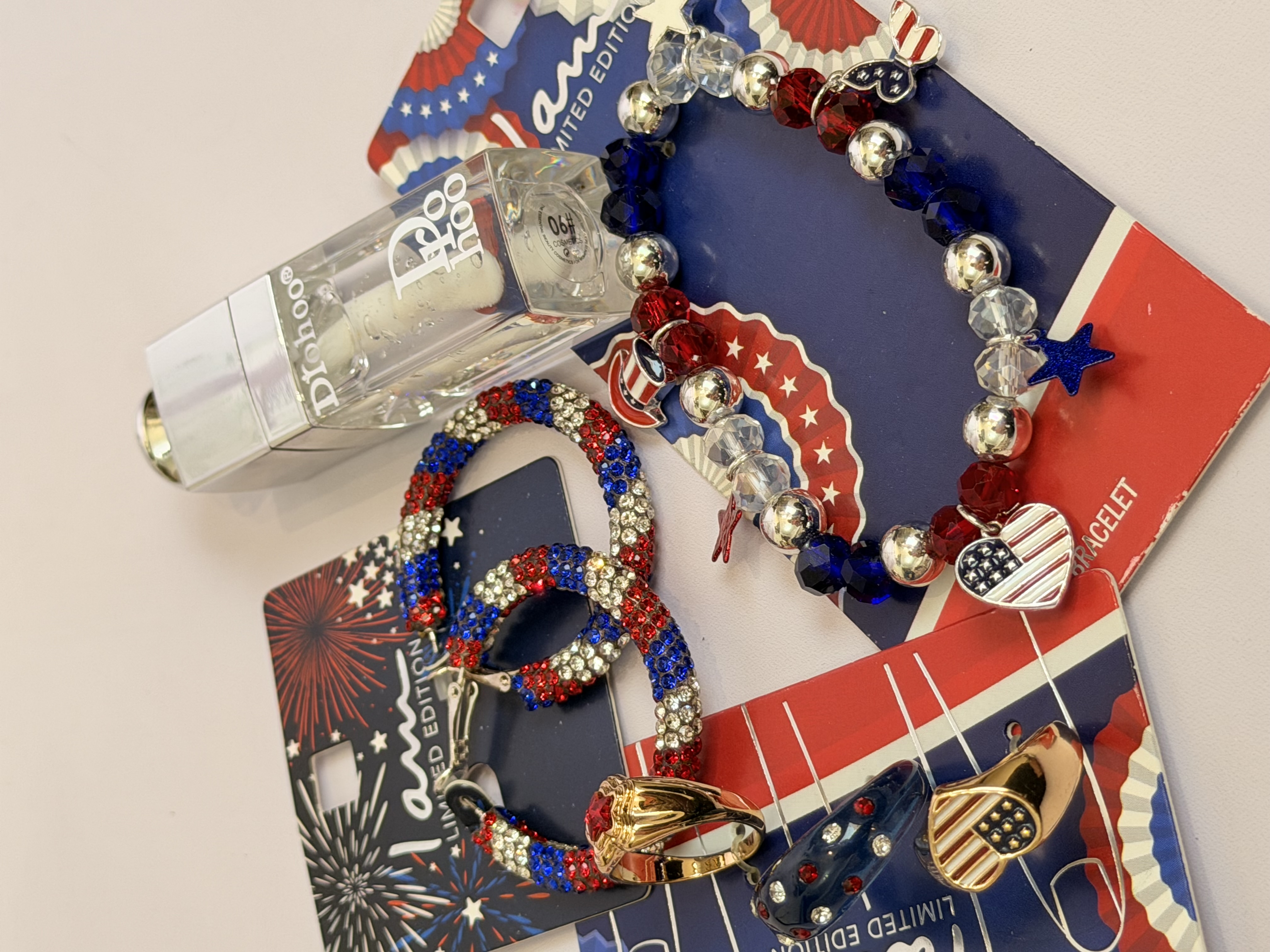 ست کامل زیورآلات مدل پرچم امریکا | پک دستبند انگشتر گوشواره + برق لب طرح Dior هدیه خاص دخترانه