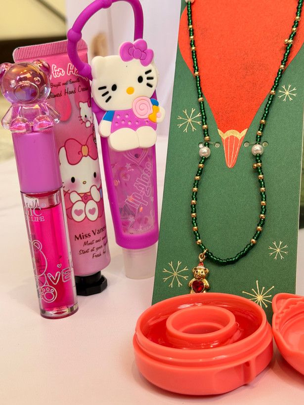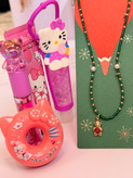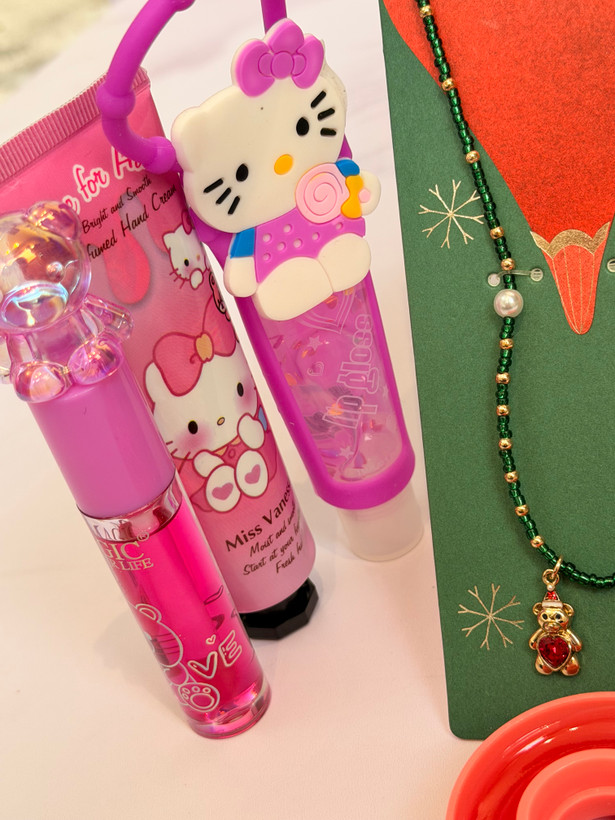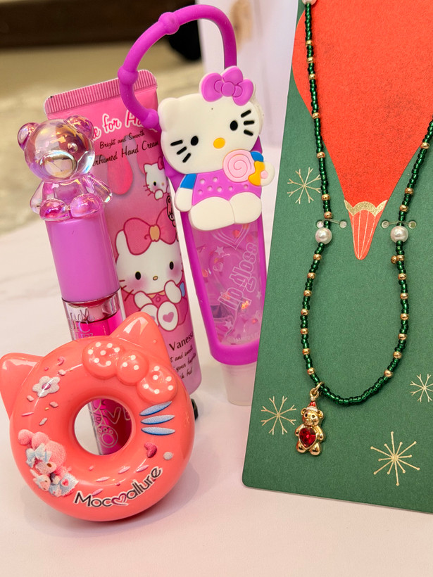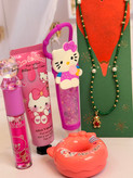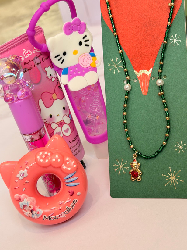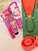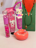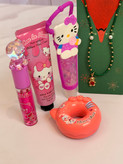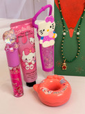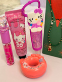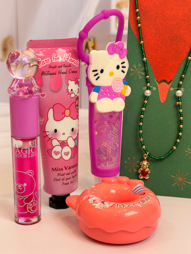 ست دخترانه فانتزی کامل | پک هدیه شامل برق لب خرسی و برق لب Hello Kitty + بالم لب دوناتی + گردنبند خرسی + کرم مرطوب کننده