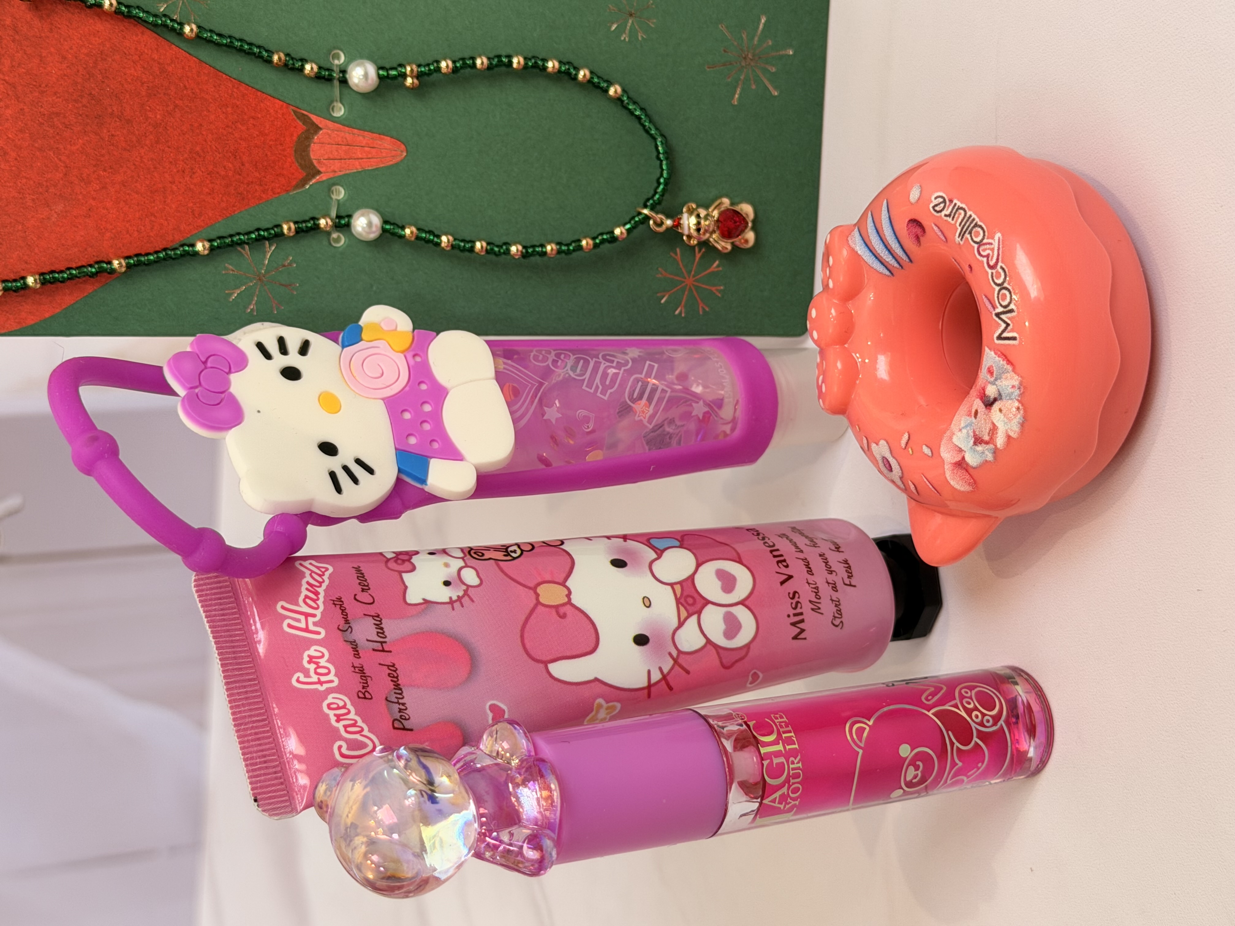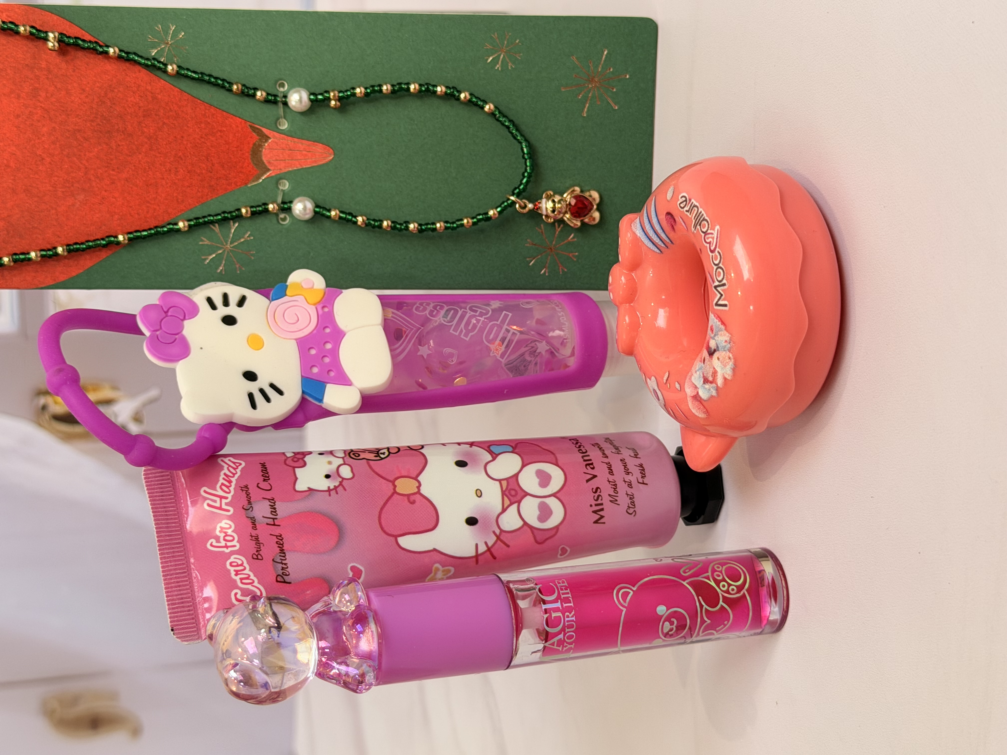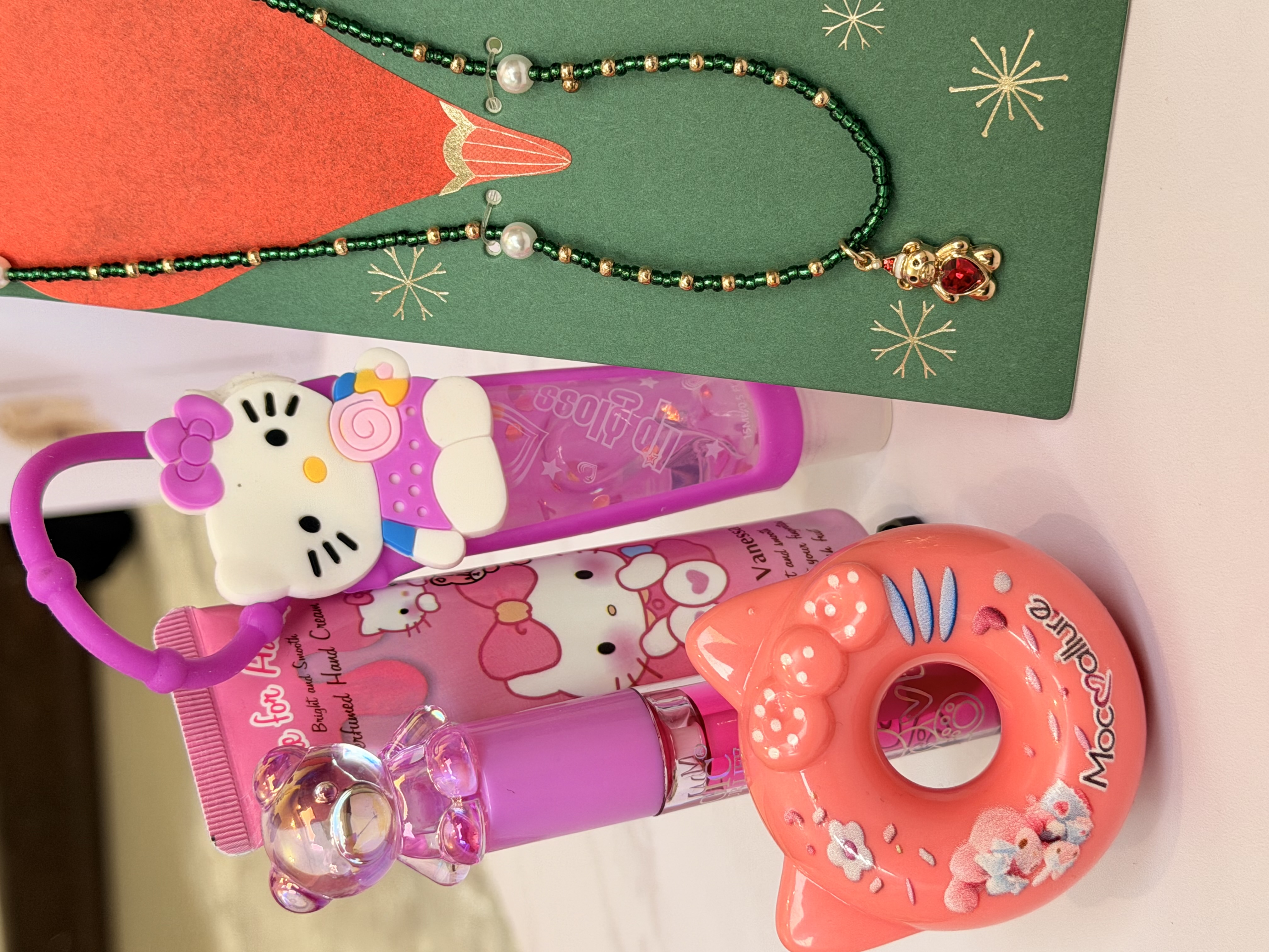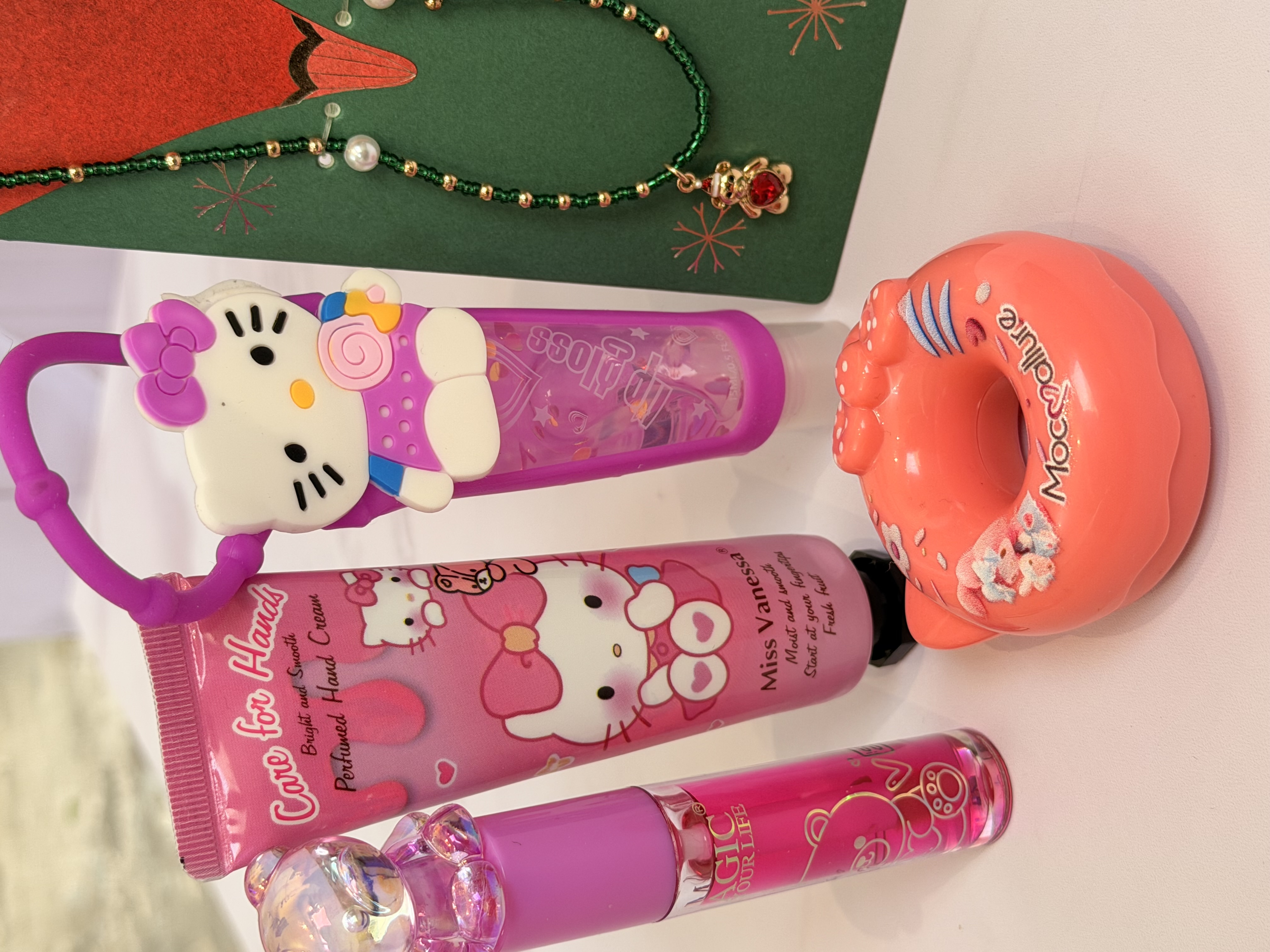 ست دخترانه فانتزی کامل | پک هدیه شامل برق لب خرسی و برق لب Hello Kitty + بالم لب دوناتی + گردنبند خرسی + کرم مرطوب کننده