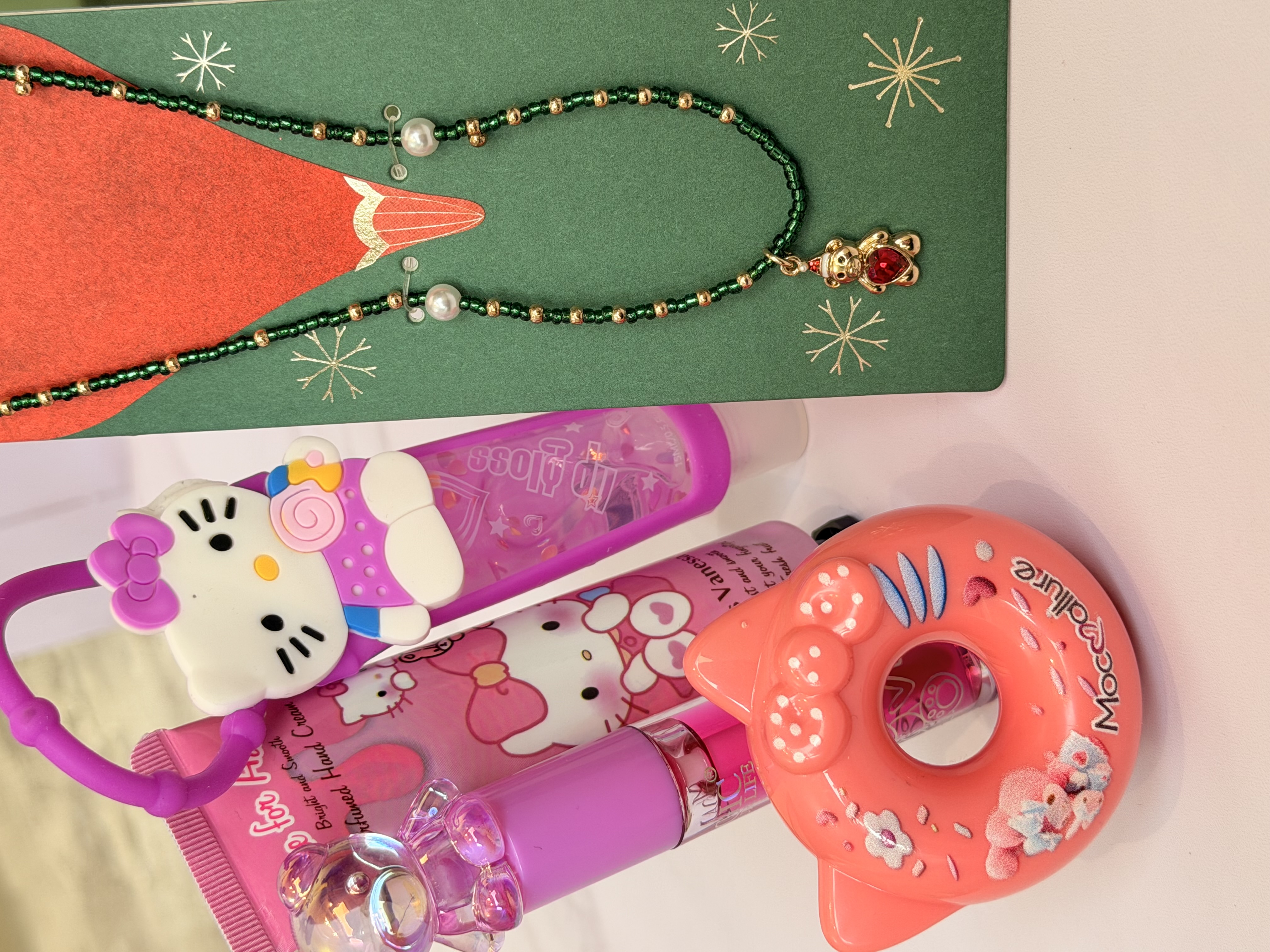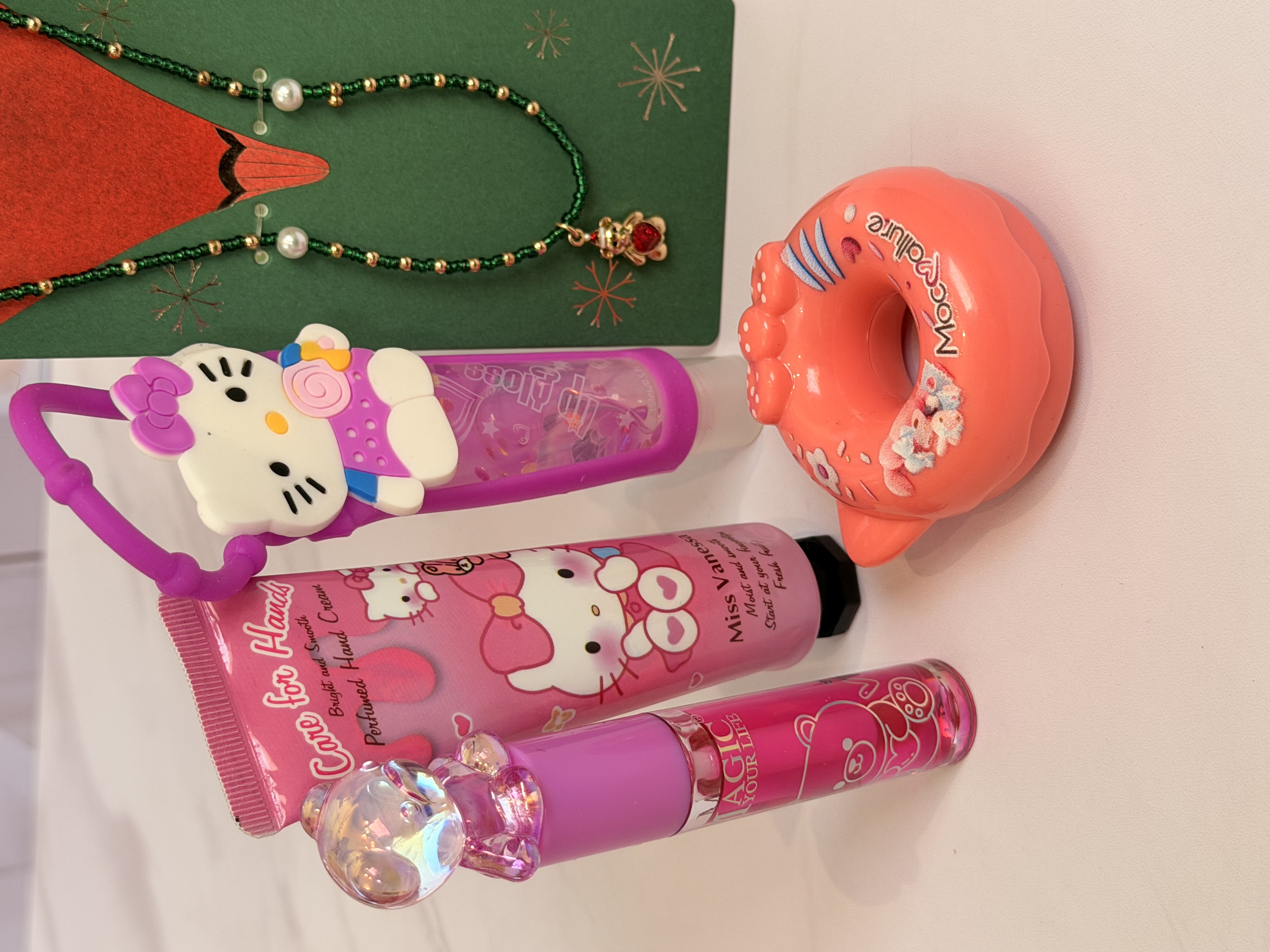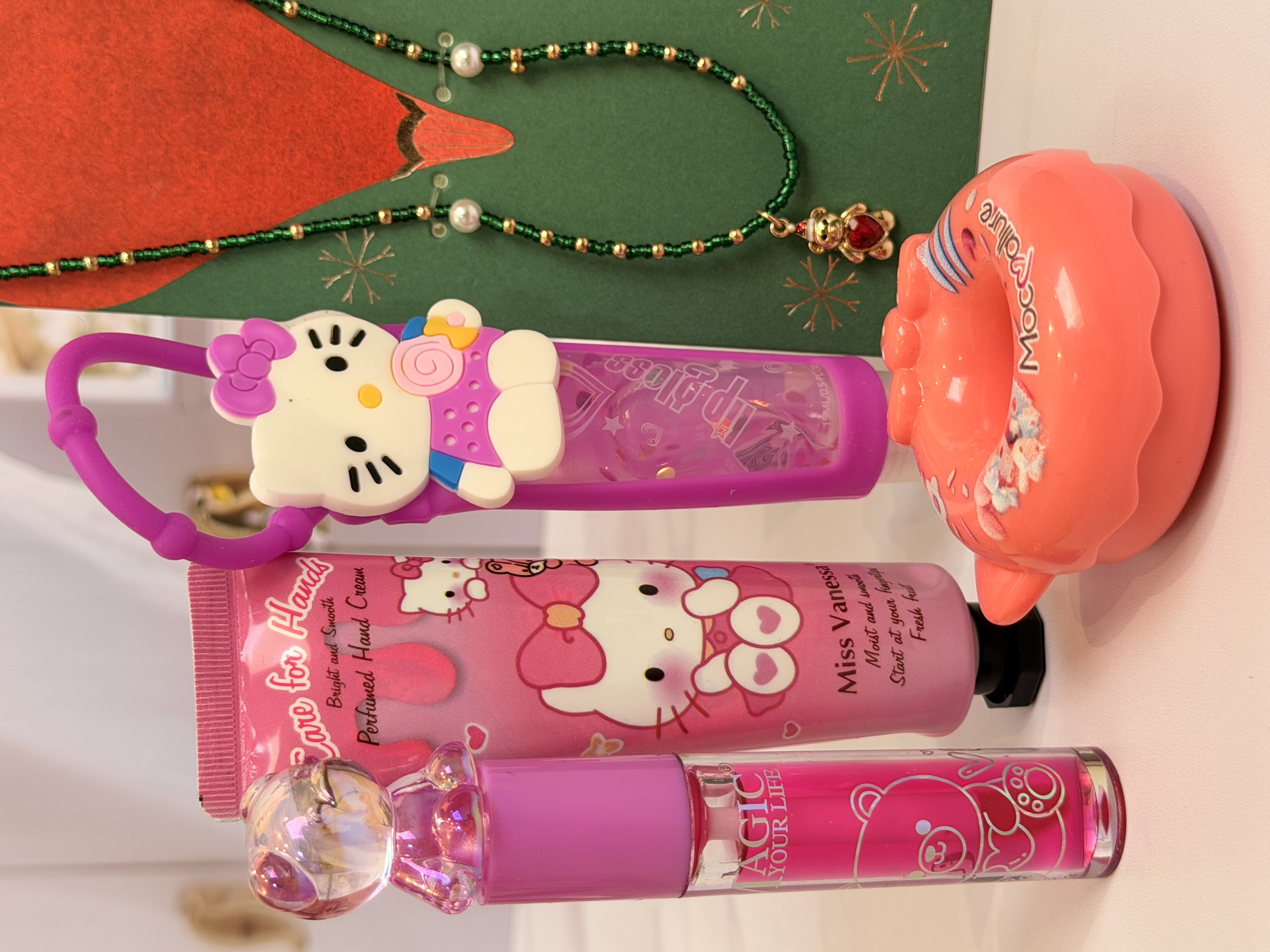 ست دخترانه فانتزی کامل | پک هدیه شامل برق لب خرسی و برق لب Hello Kitty + بالم لب دوناتی + گردنبند خرسی + کرم مرطوب کننده