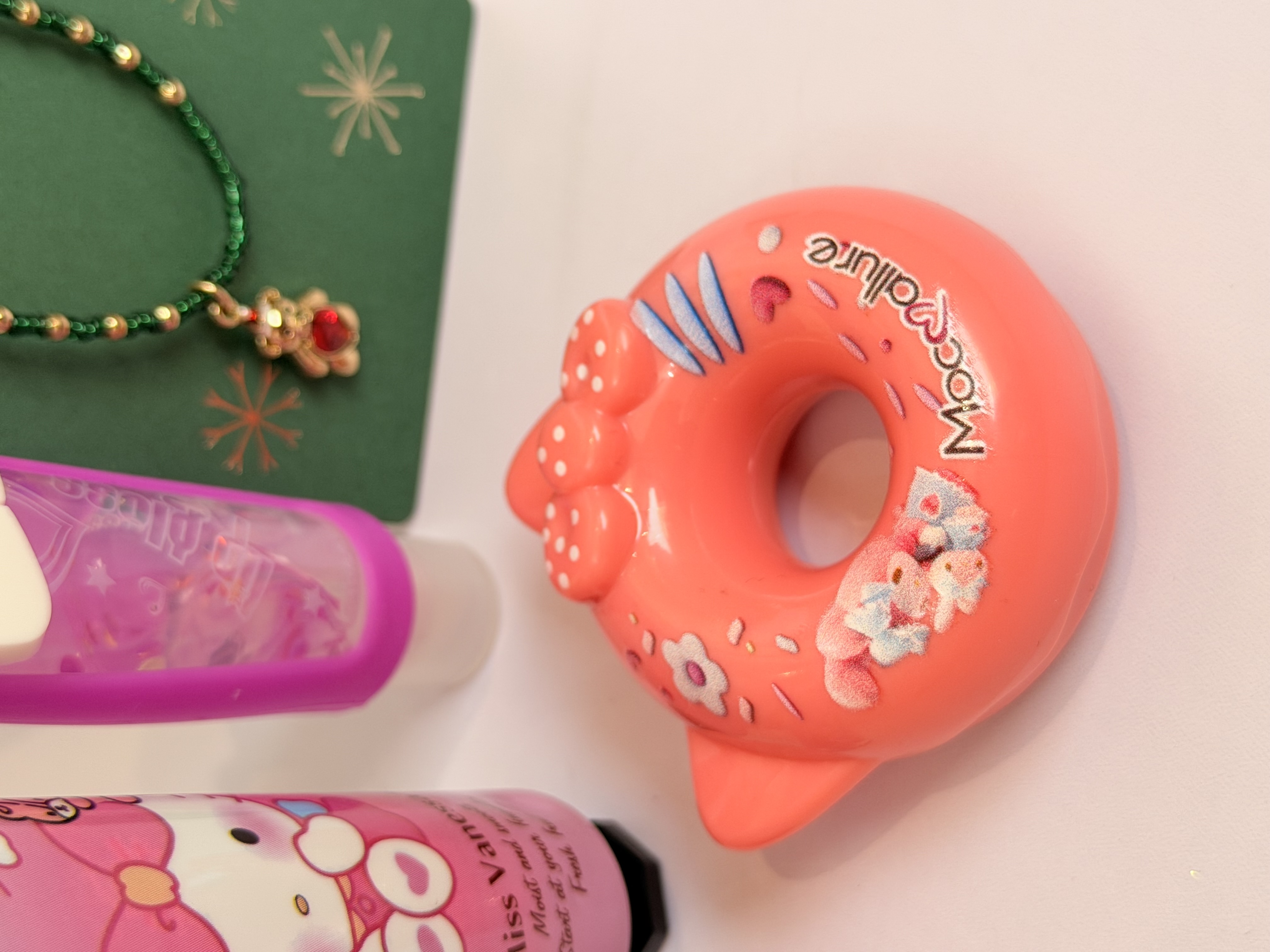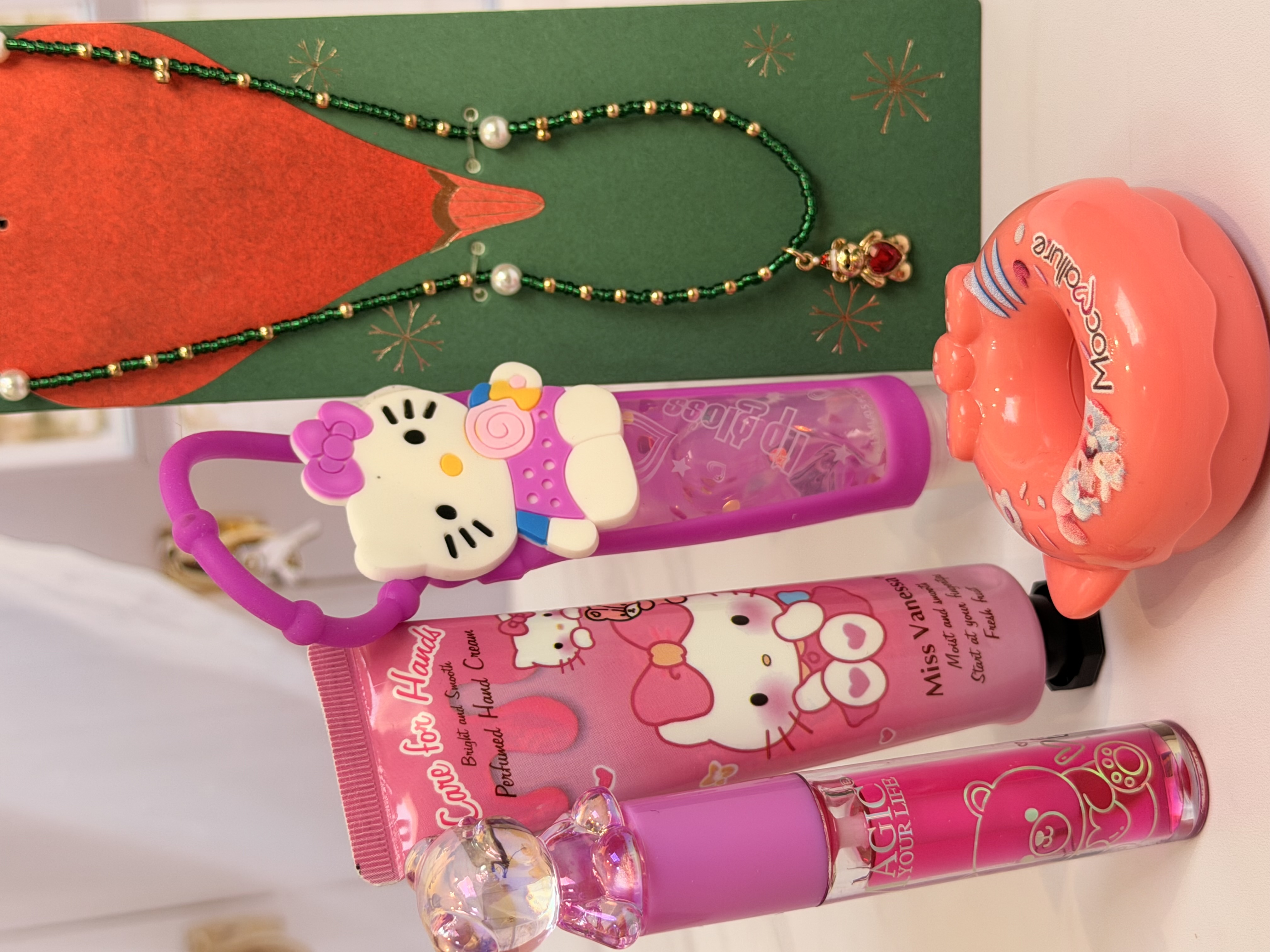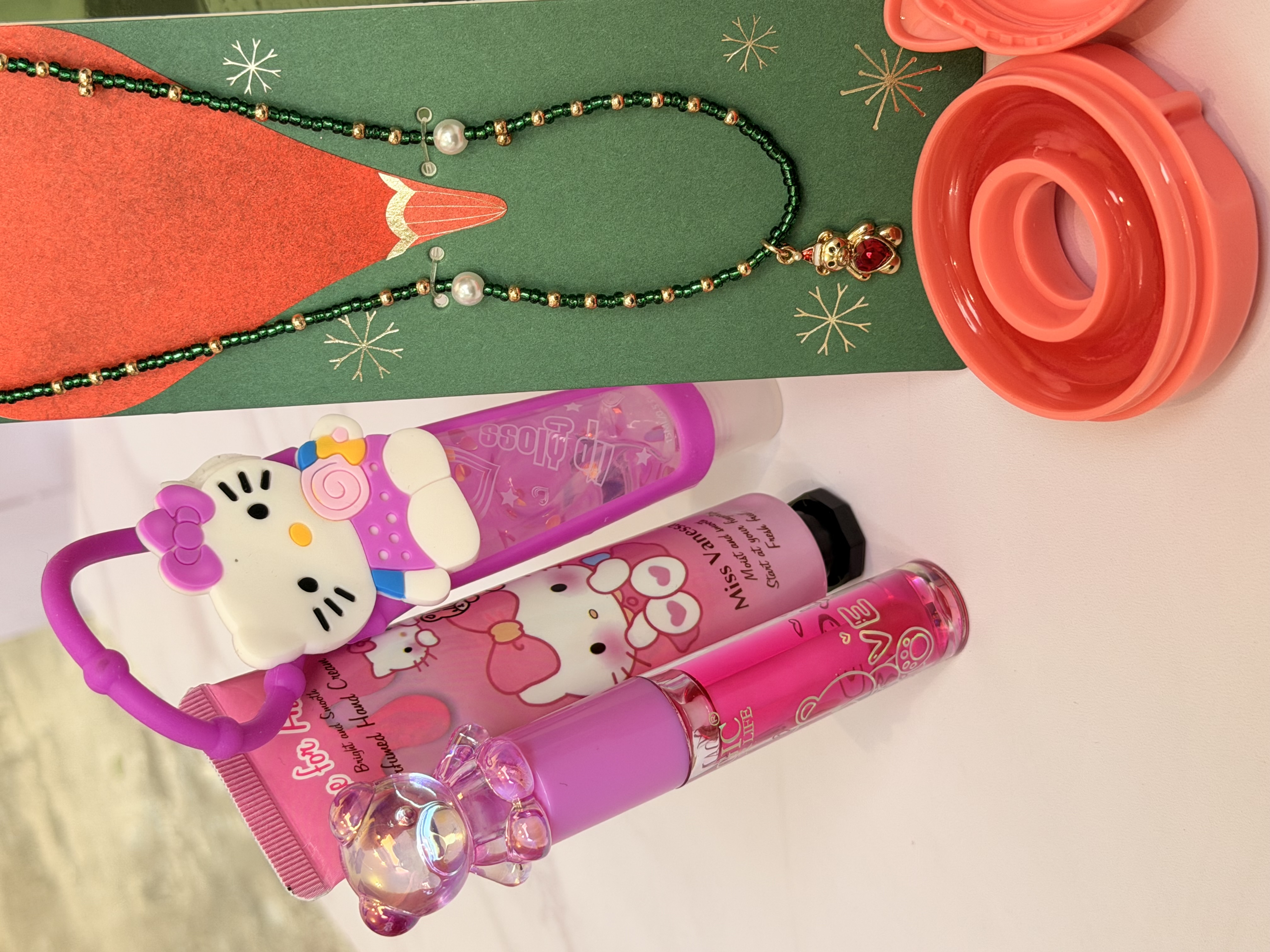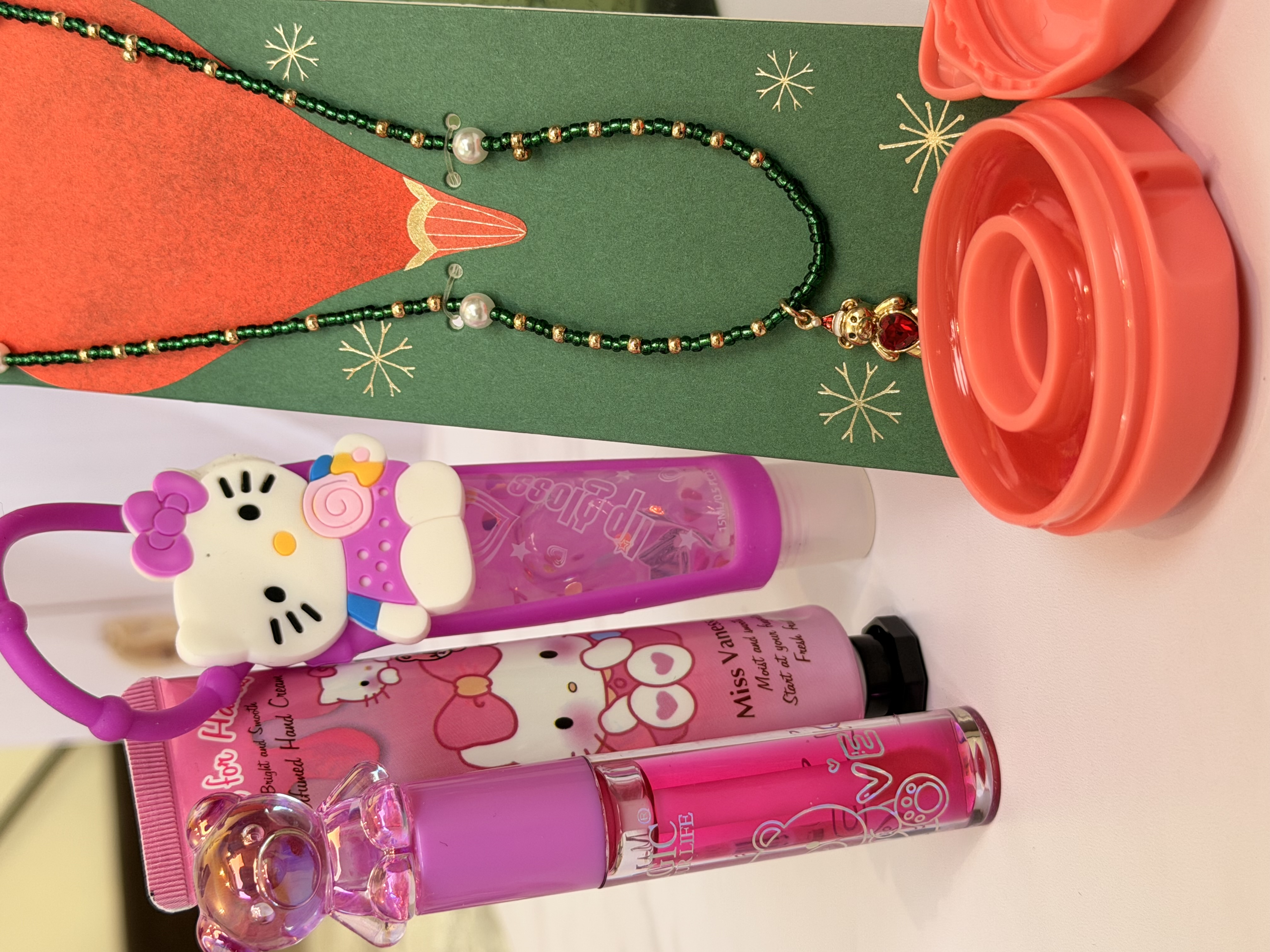 ست دخترانه فانتزی کامل | پک هدیه شامل برق لب خرسی و برق لب Hello Kitty + بالم لب دوناتی + گردنبند خرسی + کرم مرطوب کننده