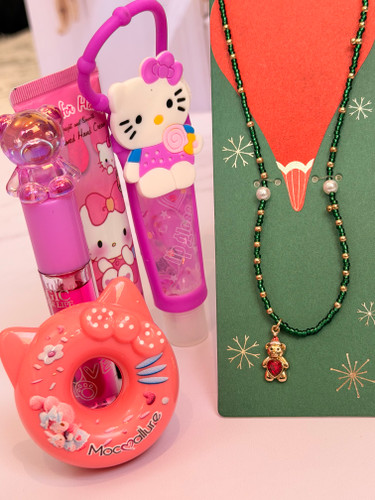 ست دخترانه فانتزی کامل | پک هدیه شامل برق لب خرسی و برق لب Hello Kitty + بالم لب دوناتی + گردنبند خرسی + کرم مرطوب کننده