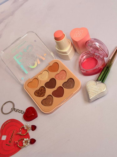 ناموجودست پک آرایشی قلبی فانتزی | مجموعه کامل لوازم آرایش قلبی شامل خط چشم رنگی + پالت سایه مات و شاین + رژگونه استیکی + بالم لب + گوشواره + جاسوئیچی