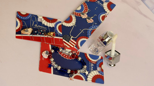 ست کامل زیورآلات مدل پرچم امریکا | پک دستبند انگشتر گوشواره + برق لب طرح Dior هدیه خاص دخترانه