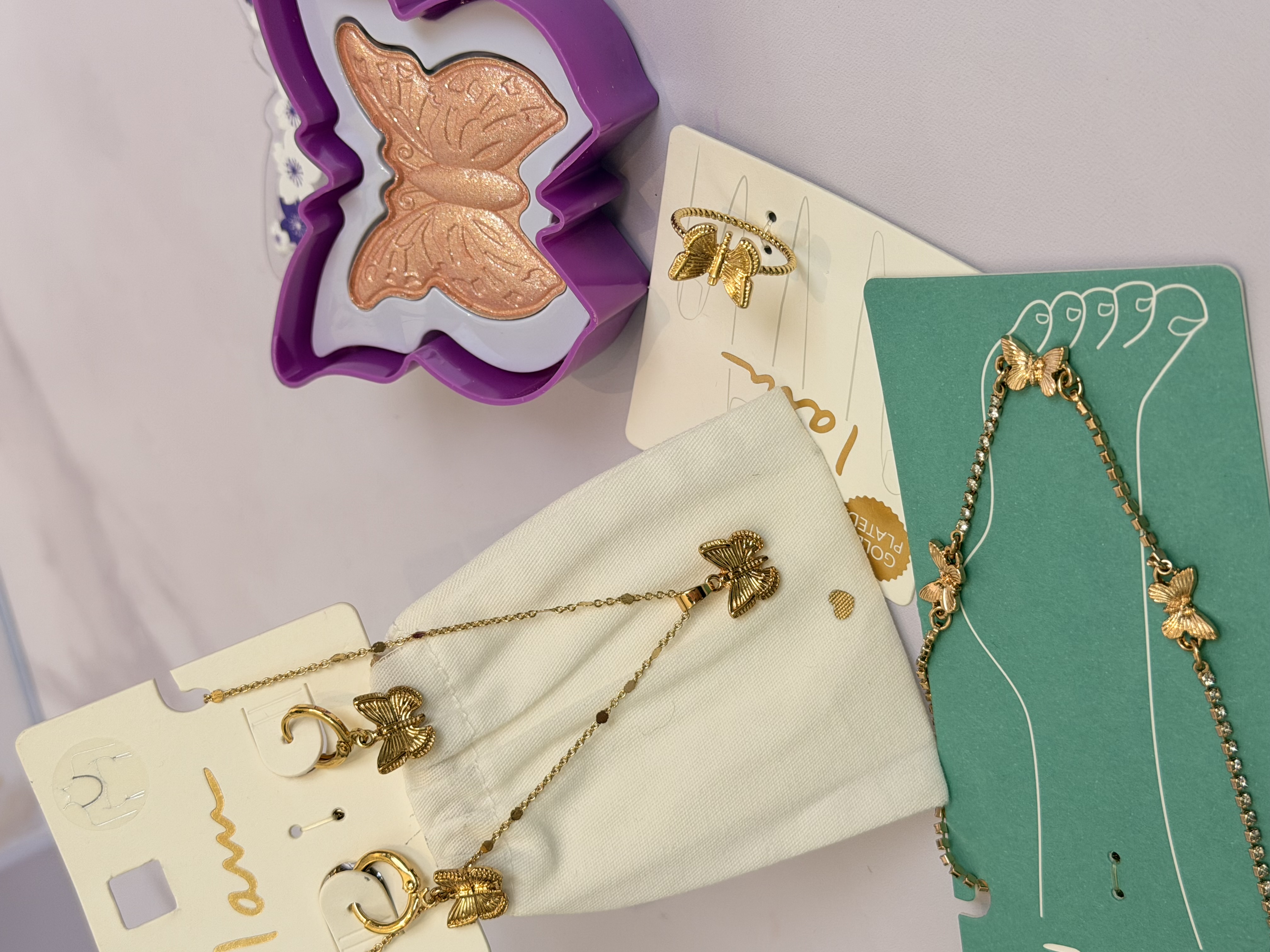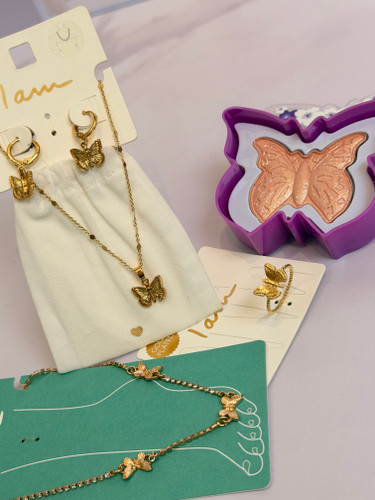 ست کامل زیورآلات پروانه + هایلایتر پروانه | پک خاص شامل نیمست پروانه انگشتر پابند و هایلایتر خوشبو مناسب هدیه