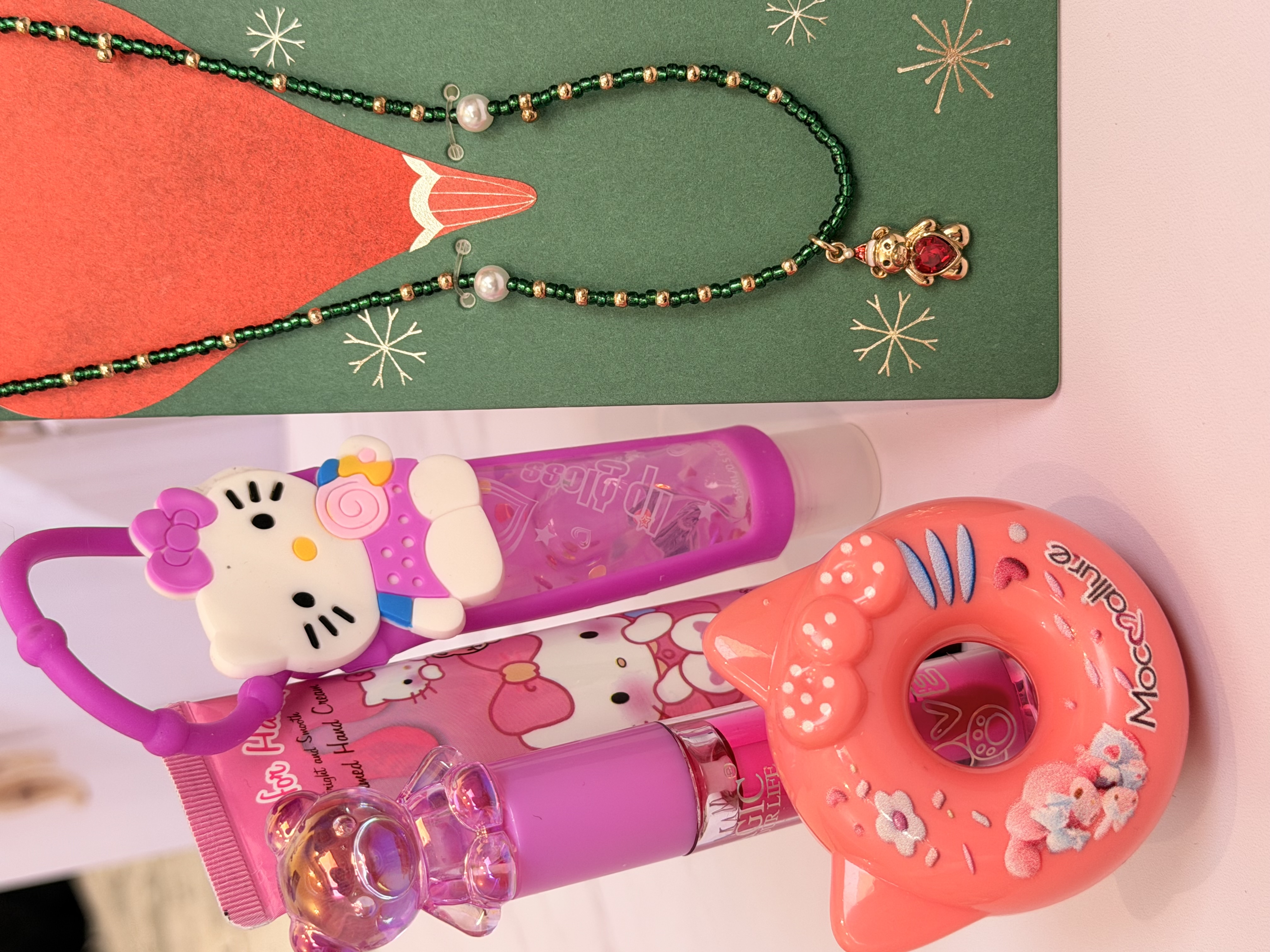 ست دخترانه فانتزی کامل | پک هدیه شامل برق لب خرسی و برق لب Hello Kitty + بالم لب دوناتی + گردنبند خرسی + کرم مرطوب کننده
