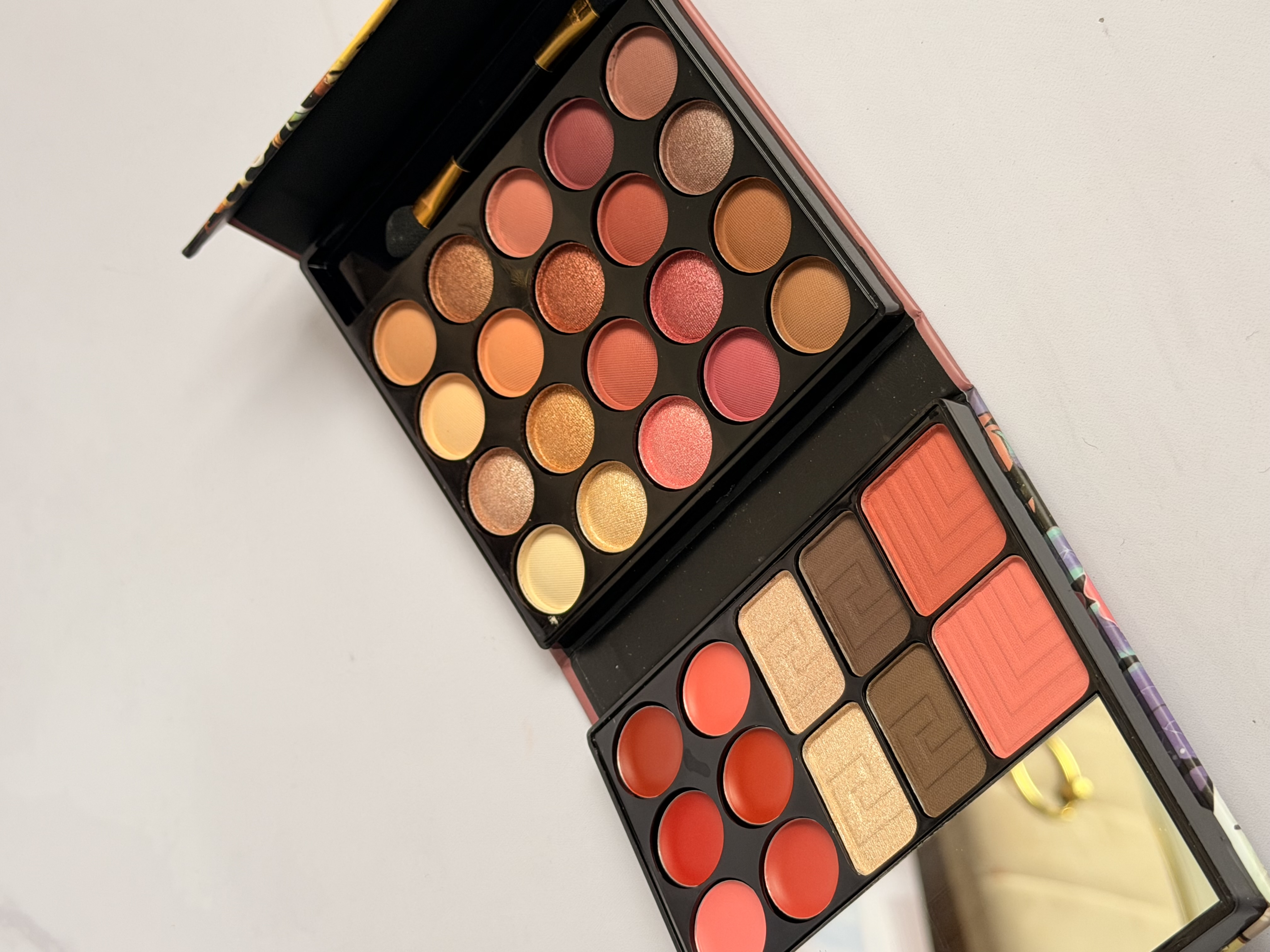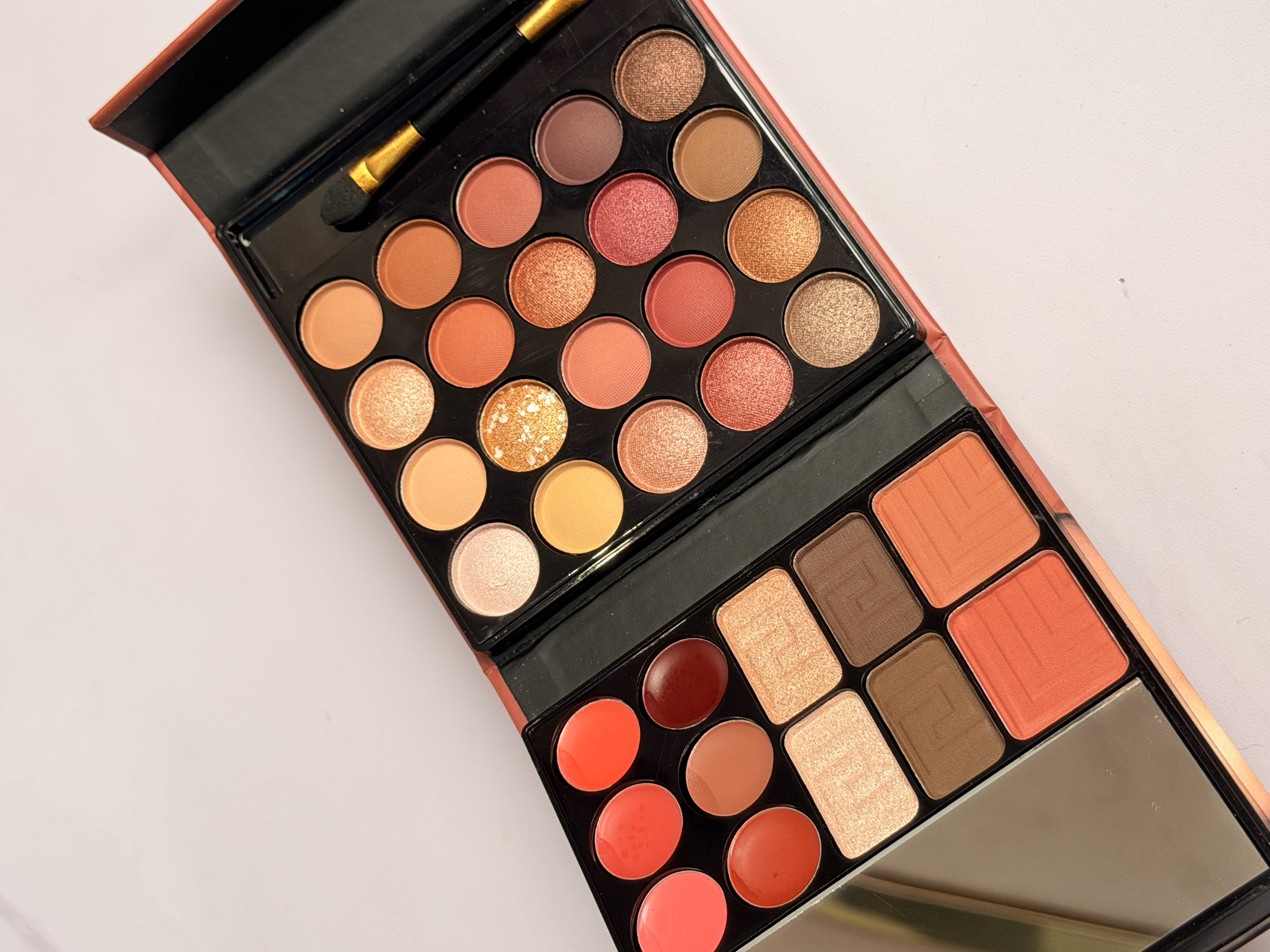 پالت آرایشی کامل تخفیف ویژه با قیمت ویژه به دلیل اسیب دیدگیه کوچک د یک سایه فقط یک رنگ سفید ردیف اول اسیب داره و مابقی سالم هست